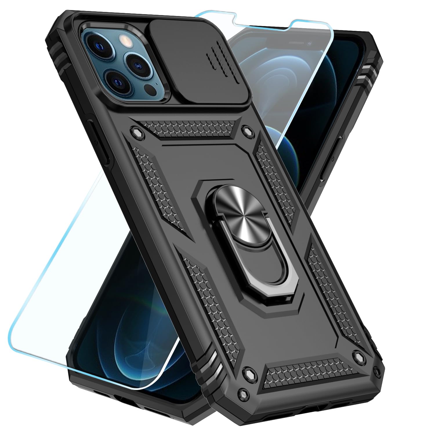 SunStory Compatible with iPhone 13 Pro Max Case with HD Screen Protector & Slide Camera Cover & Rotated Ring Kickstand, [Military-Grade] Phone Case