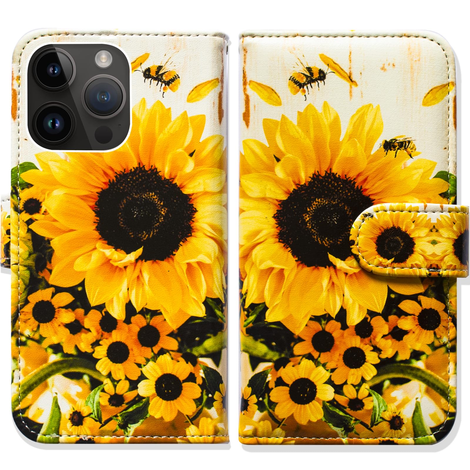 Bcov Case for iPhone 15 Pro,Sunflower Bee Leather Flip Phone Case Wallet Cover with Card Slot Holder Kickstand for iPhone 15 Pro