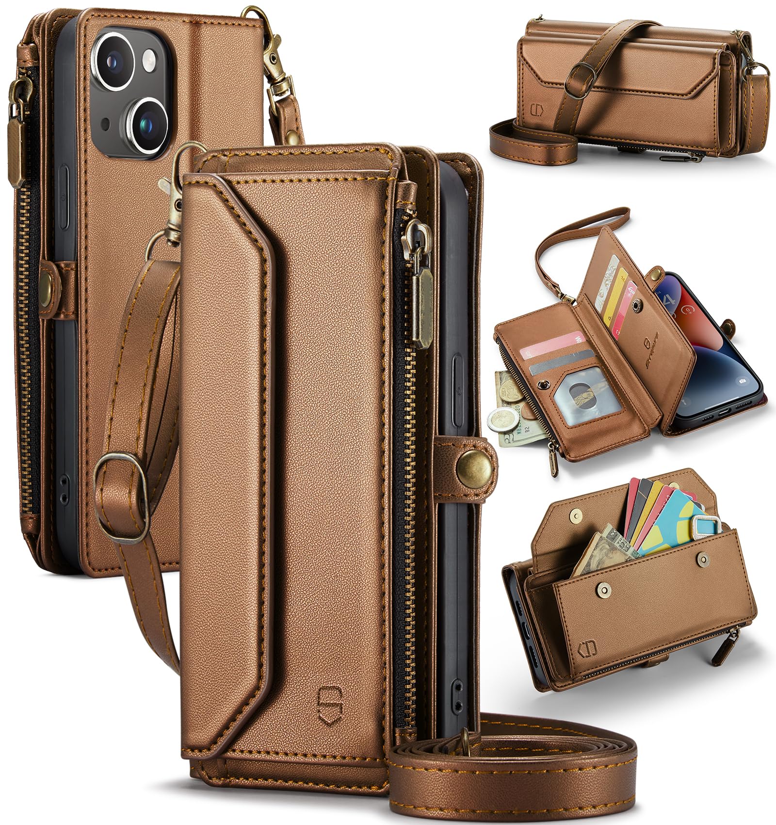 Strapurs Wallet Case Compatible with iPhone 14 RFID Blocking 7-Card Holder Soft PU Leather Magnetic Snap Shoulder Strap Zipper Pocket Phone Case Fit