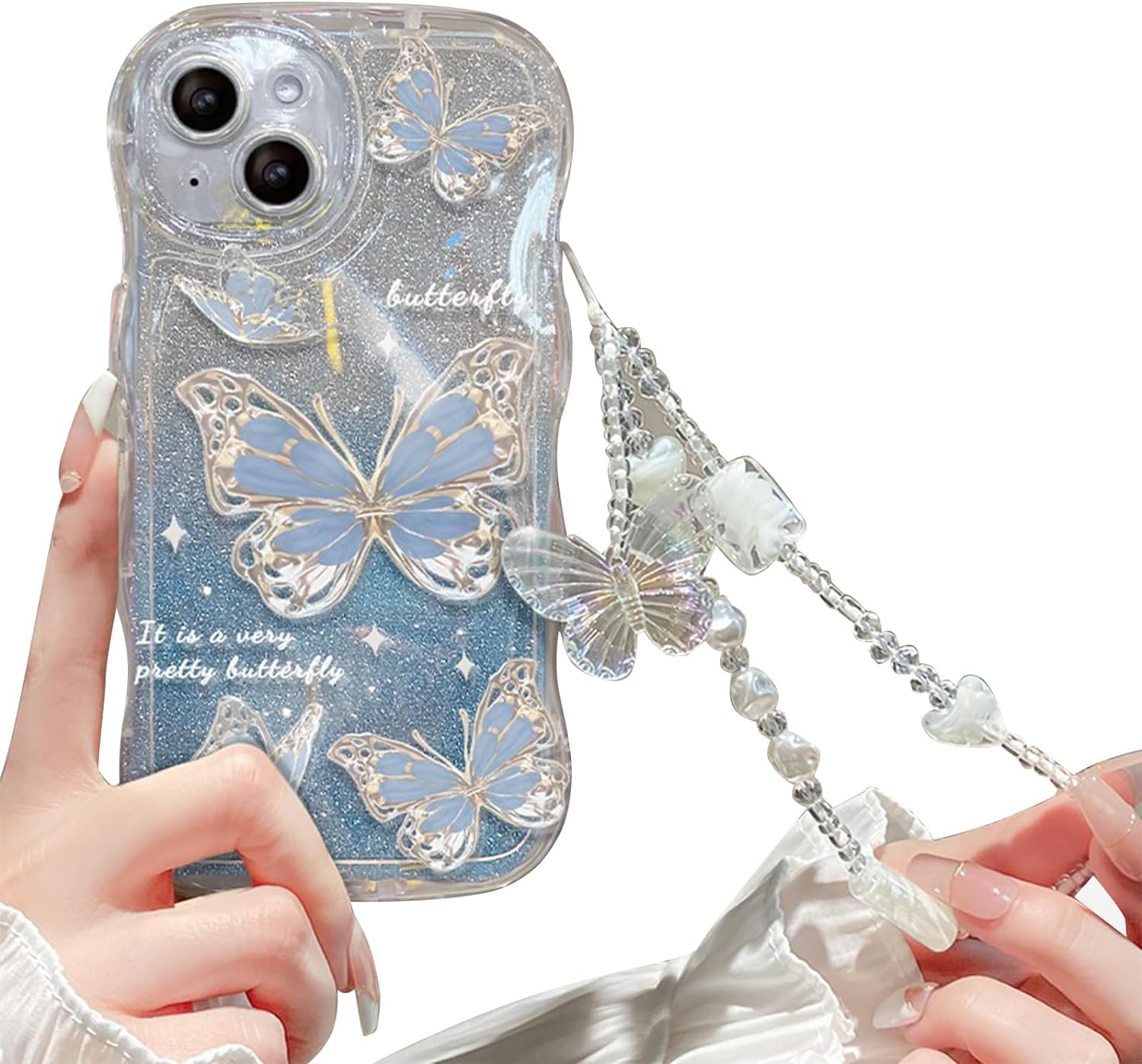 Cutecasee Compatible with iPhone 15 Case for Women/Girls, Cute Butterfly Glitter Bling with Bracelets Anti-Scratch Shockproof Case for iPhone 15, Blue