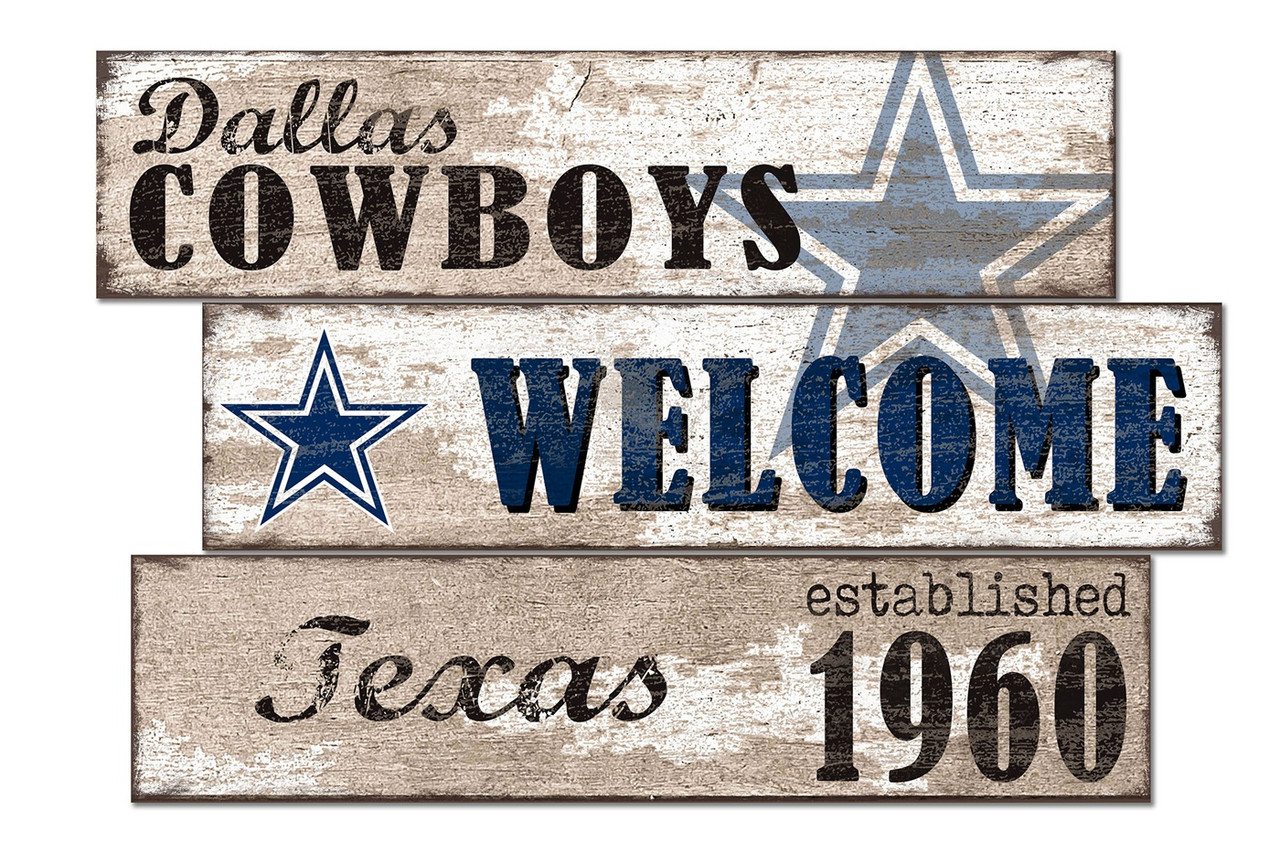The Dallas Cowboys Welcome 3 Plank Sign by Fan Creations is custom printed to mimic the rustic look of real wood. Designed and produced in the USA, this gift item is perfect for the biggest sports fan!