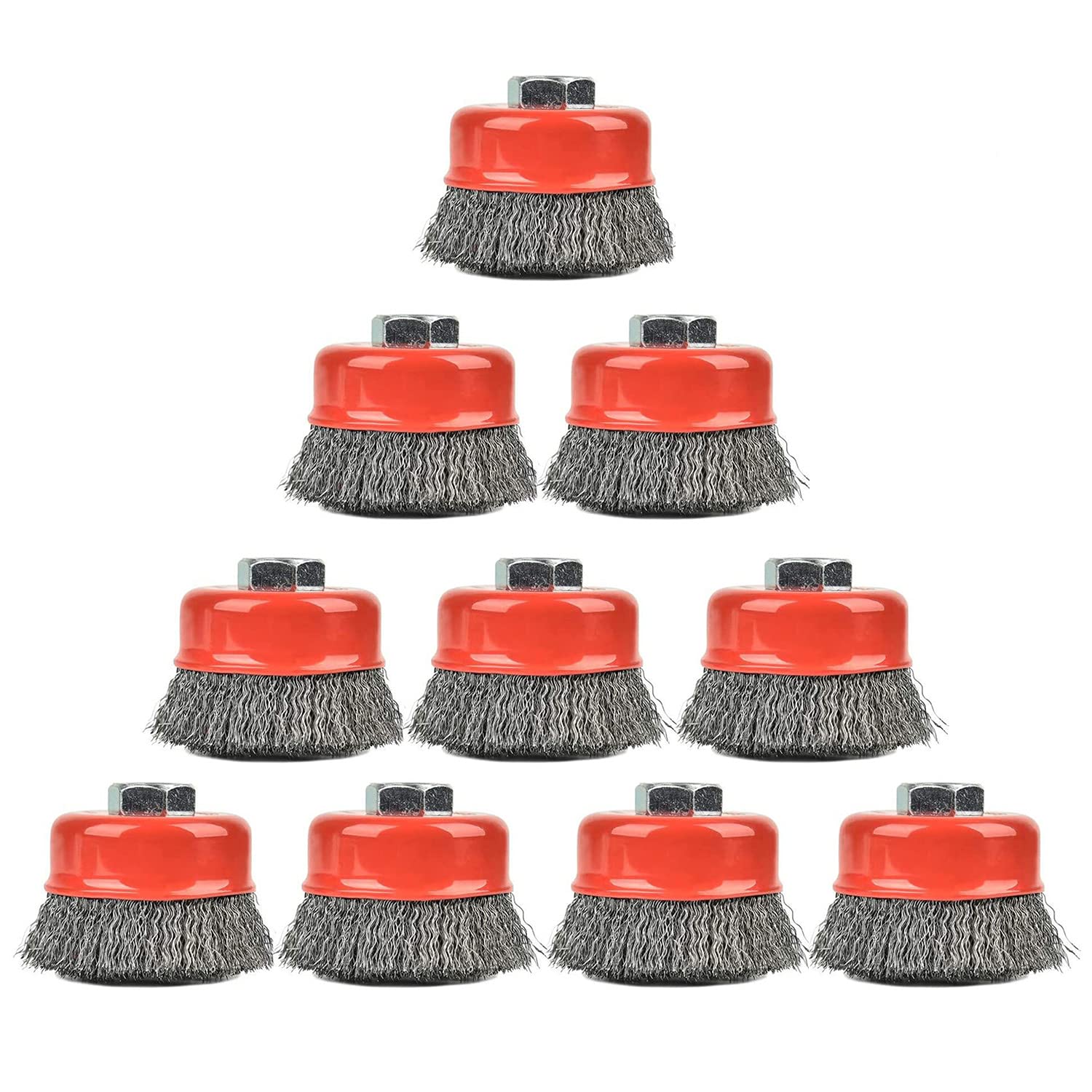 10PCS 3 Inch Carbon Steel Crimped Wire Wheel Cup Brush Set for Grinders, Coarse Crimped with 5/8-Inch-11 Threaded Arbor, Max RPM 12,500, Light-Duty
