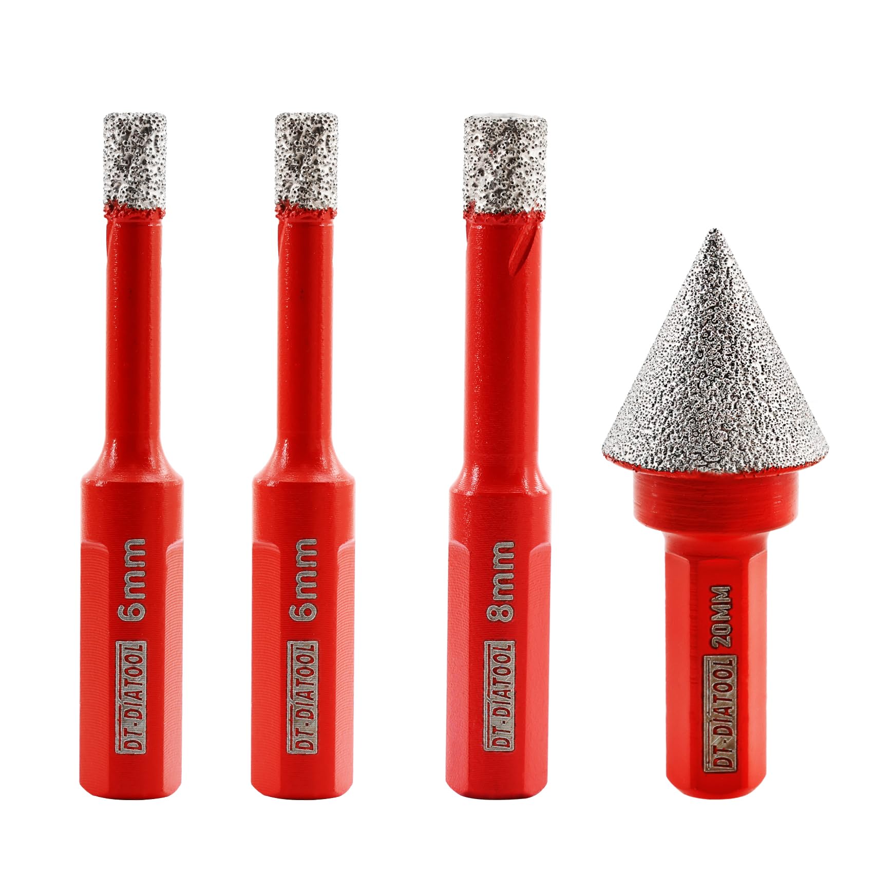 DT-DIATOOL Diamond Drill Bits Triangle Shank 4pcs/Set - 6/6/8mm with 1pc 20mm Diamond Chamfer Bit for Porcelain Tile Ceramic Marble Granite Masonry