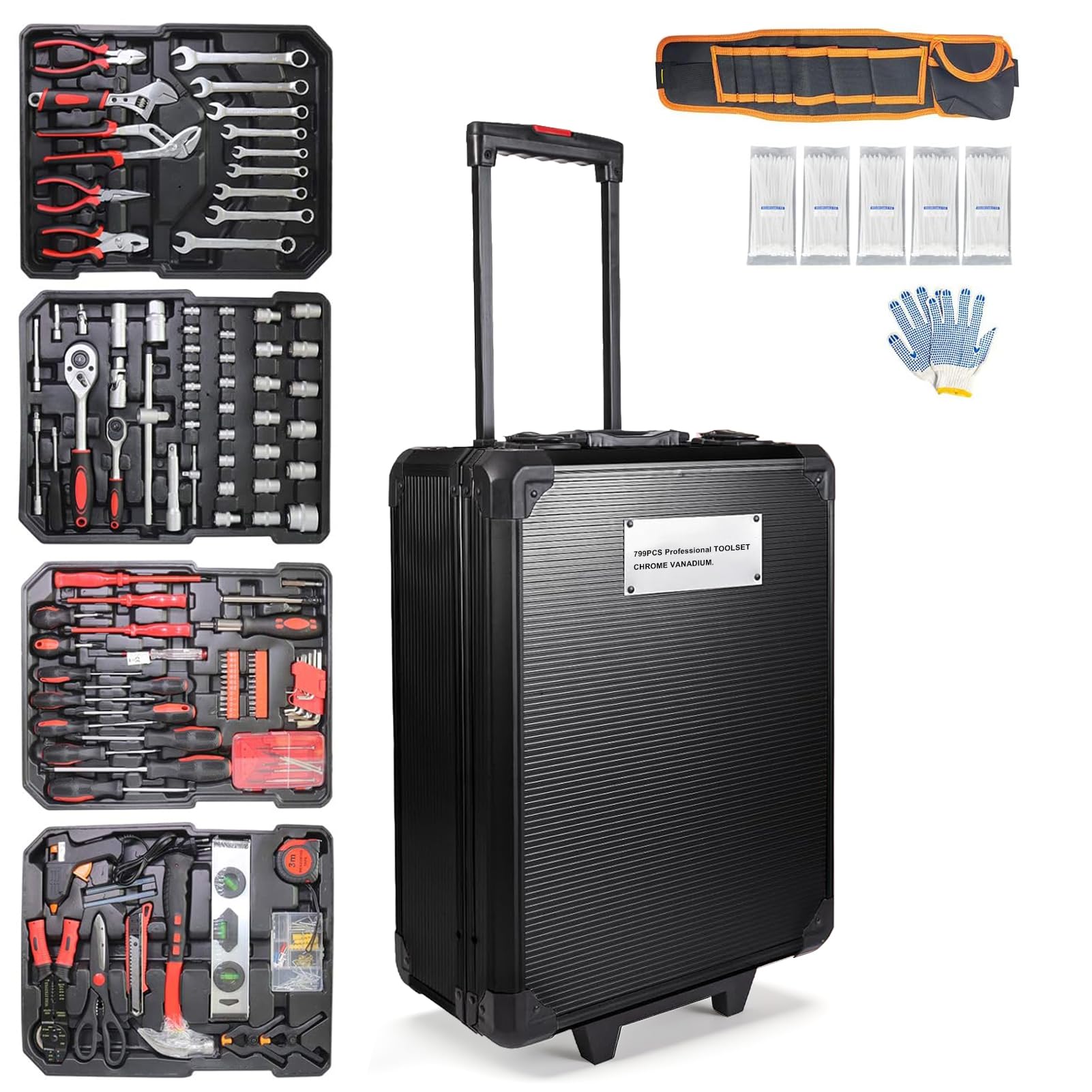 Arcwares 799pcs Aluminum Trolley Case Tool Set Silver, House Repair Kit Set, Household Hand Tool Set, with Tool Belt,Gift on Father's Day (Black)