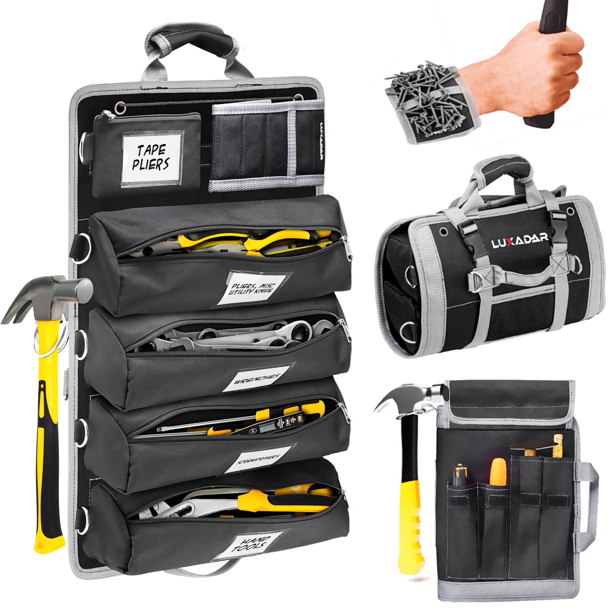 All-In-One - all 5 pockets are removable, Metal D-Links, Magentic Wristband Hammer Metal ring, YKK Zippers, Double Stitching, 5 Outside easy access pockets, Shoulder Strap with protection, Secure Hammer velcro rings, Removable Name Tags, Fits over 265 tools, water resistant, Easy to Carry Design, Gr