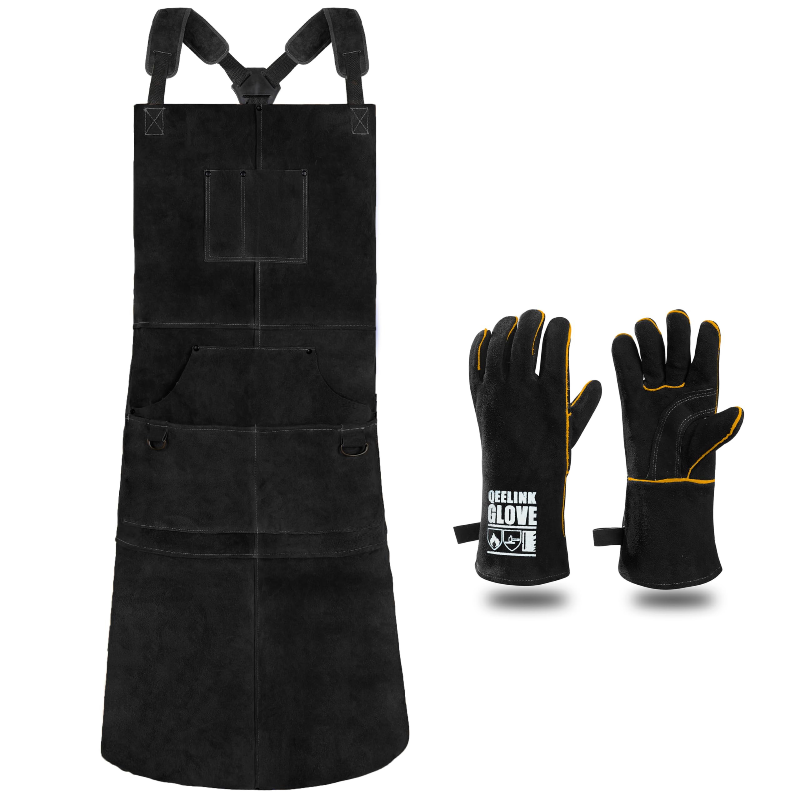 SUPERIOR PROTECTION APRON: Heat & Flame-Resistant heavy duty split cowhide leather welding apron. Extra Long ( 24 inches wide x 42 inches tall ) full coverage apron protect you until the knee when you are working. HIGH QUALITY GLOVES: Durability with high grade of 🇺🇸 US split leather available