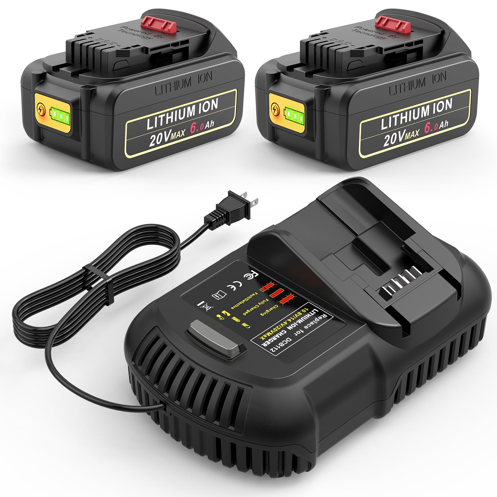 Labtec 6.0Ah 6000mAh Replacement for Dewalt 20V Battery & Charger Combo (2-Pack + Charger) - Compatible with DCB200/DCB180 Series Power Tools