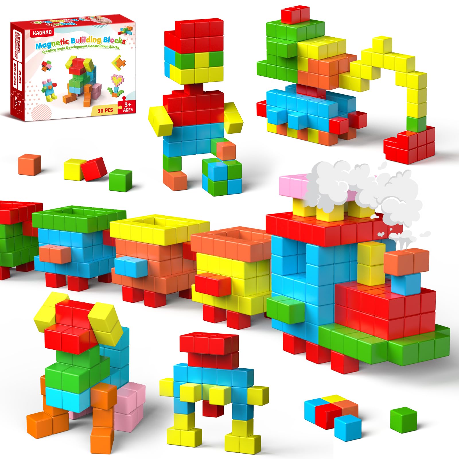 【Safe and High-quality Material】Our magnetic blocks are made of safe ABS plastic. Large sized magnetic cubes not only effectively prevent swallowing problems, but are also suitable for small hands to grip. 【30 PCS Kids Toys】Our magnetic building blocks includes 30 pcs blocks (0.98IN, 6 diffe