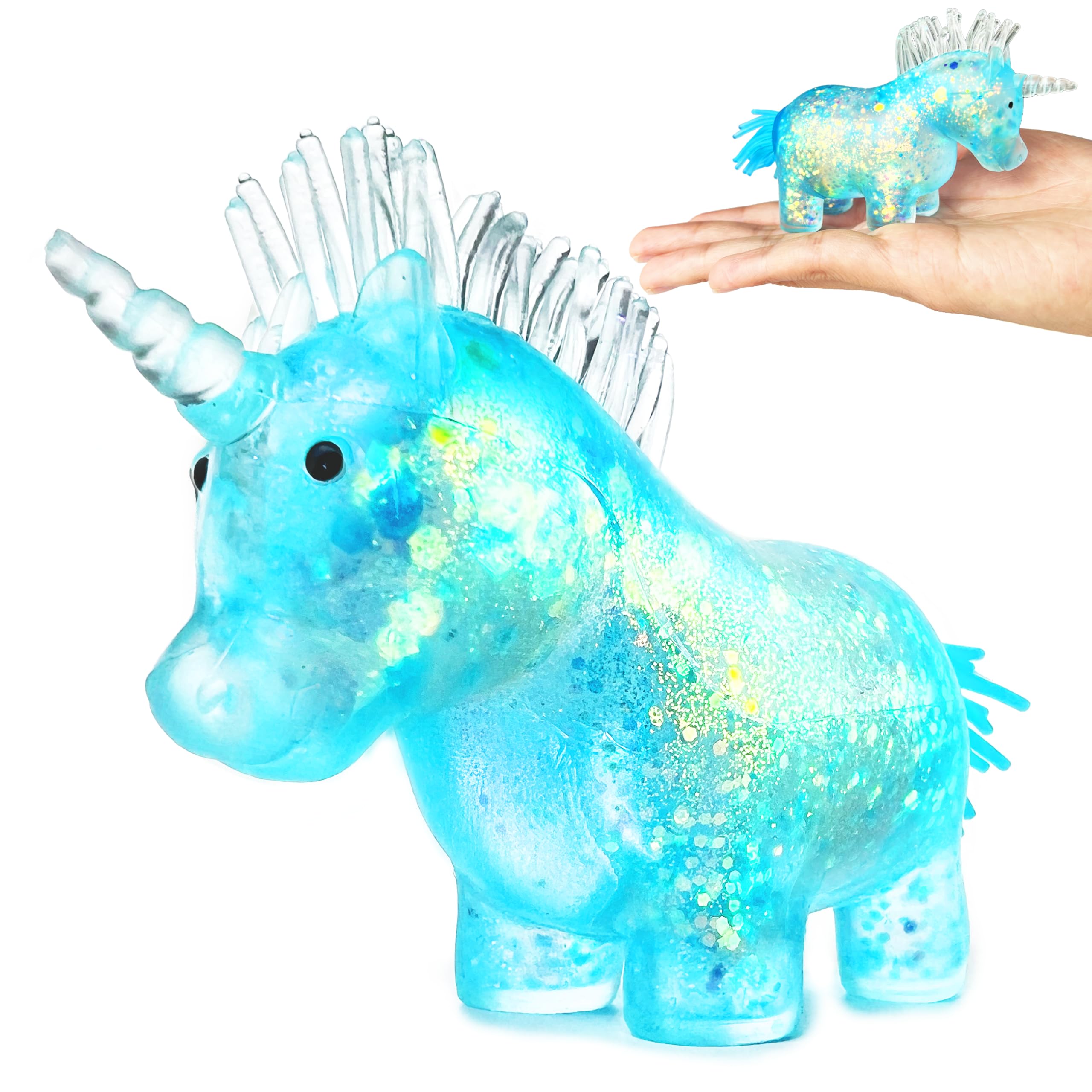 GLITTERY UNICORN GUMMY DESIGN: Adorable cartoon unicorns with sparkling glitter and a sugar ball like texture make these squishies irresistible. A must-have for unicorn lovers and fans of kawaii decor COMPACT STRESS TOYS ON-THE-GO: Pocket-sized and lightweight, these unicorn squeeze balls fit in bac