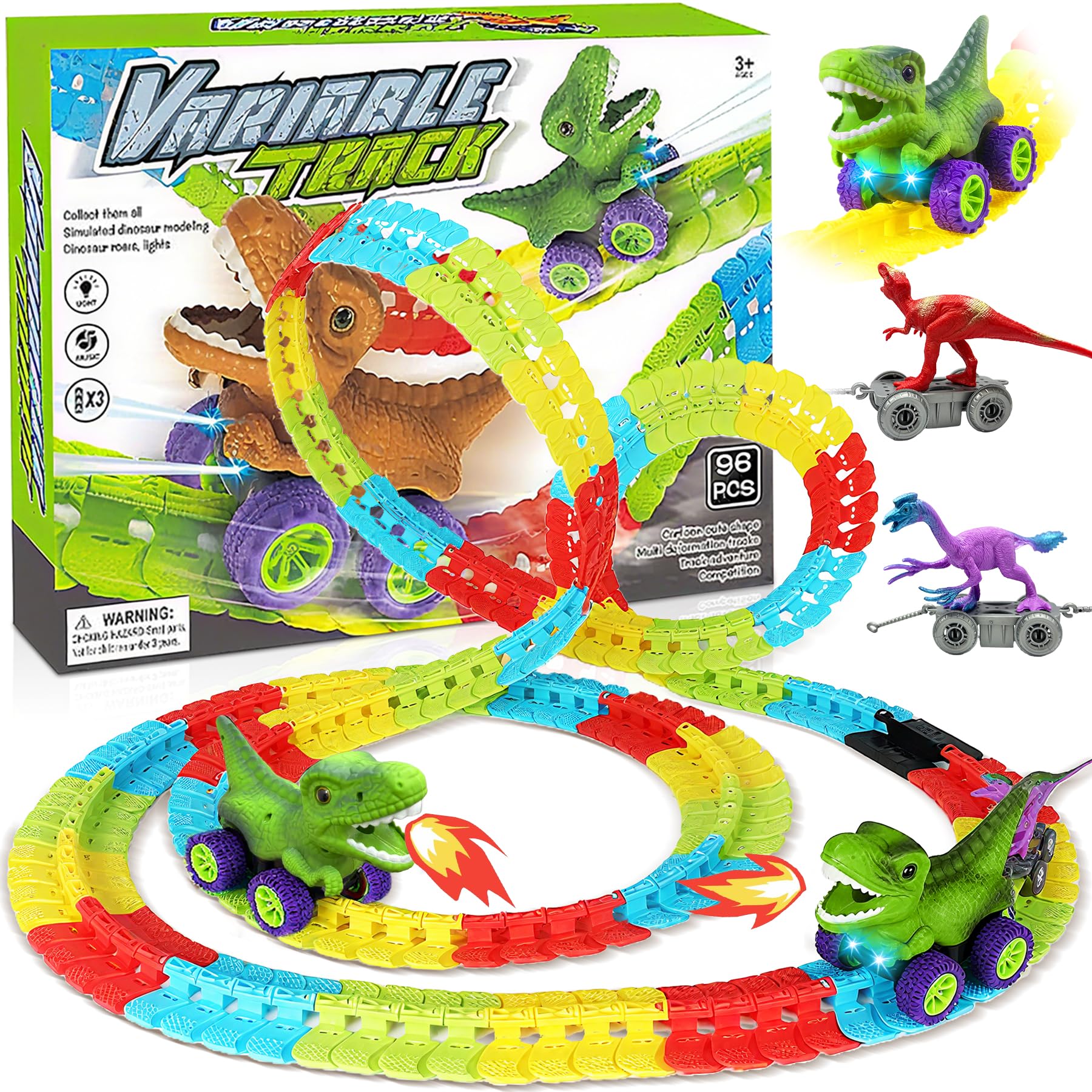 96pcs Dinosaur Train Set, Dinosaur Toys, Dinosaur Car Toy 360° Electric Climbing Race Tracks with Sound and Lights, Dinosaur Toys for Living Room,