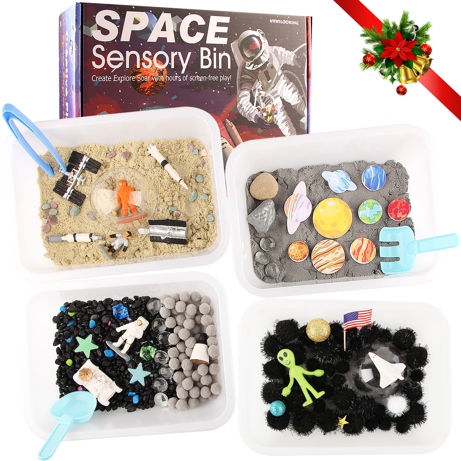 OUTER SPACE SENSORY BIN: Blast off on a intergalactic mission with a galaxy sensory bin filled with 9 planets, 6 kind of different textures, astronaut, alien, and more! This self-contained bin is an out of this world toddler sensory experience, and galaxy themed gift for kids! PLANETS SENSORY TOYS: