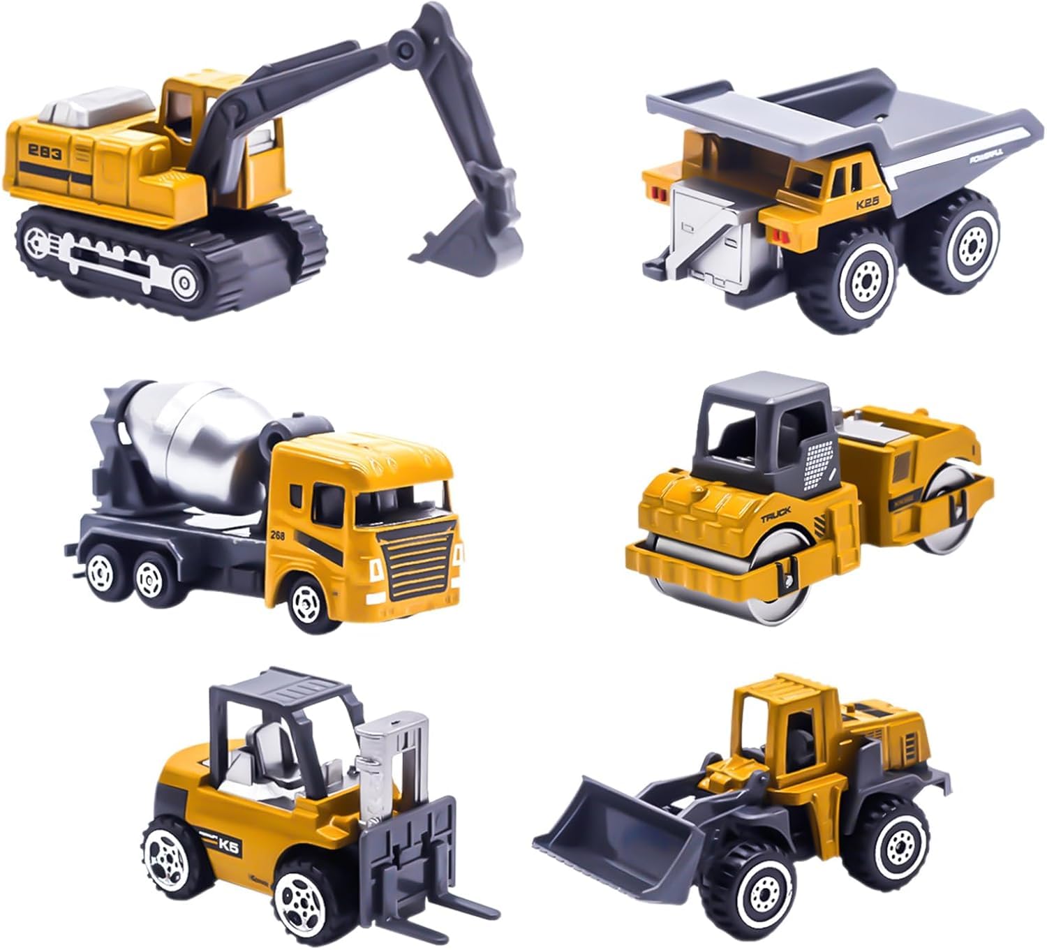 6 Pack Diecast Construction Vehicles: Super value 6pcs construction toys trucks! 1:64 scale alloy die cast construction toy vehicles for little kids; This alloy construction engineering vehicle toys set included: forklift, engineering mixer, dump truck and excavator, great construction cake toppers,
