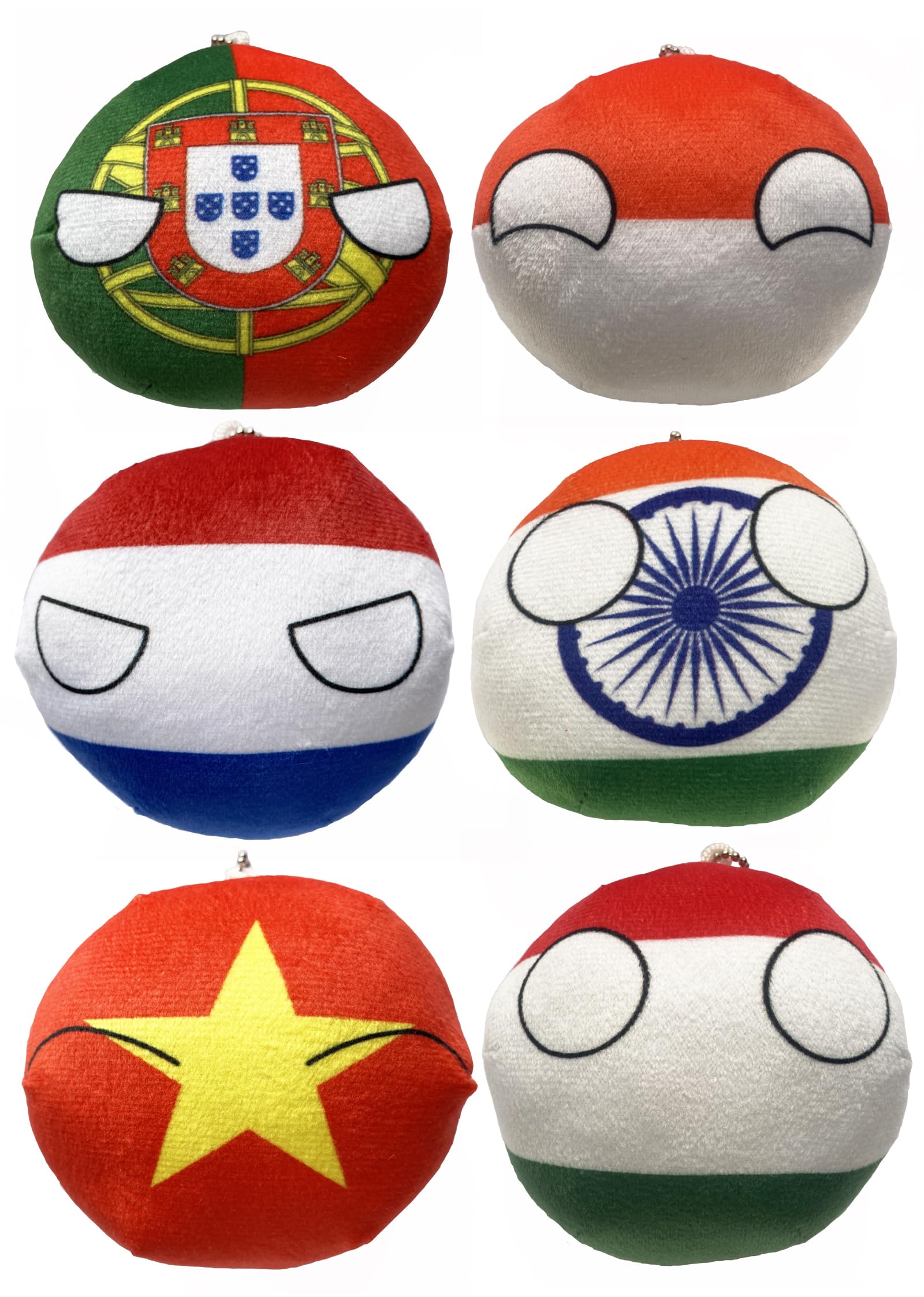 1. 6-Country Countryball Plush Set featuring Poland, the Netherlands, Portugal, Hungary, India, and Vietnam – each plush represents its national flag and iconic countryball character. 2. Premium Quality Material: Crafted with soft, durable fabric, these plushies are designed for long-lasting cuddl