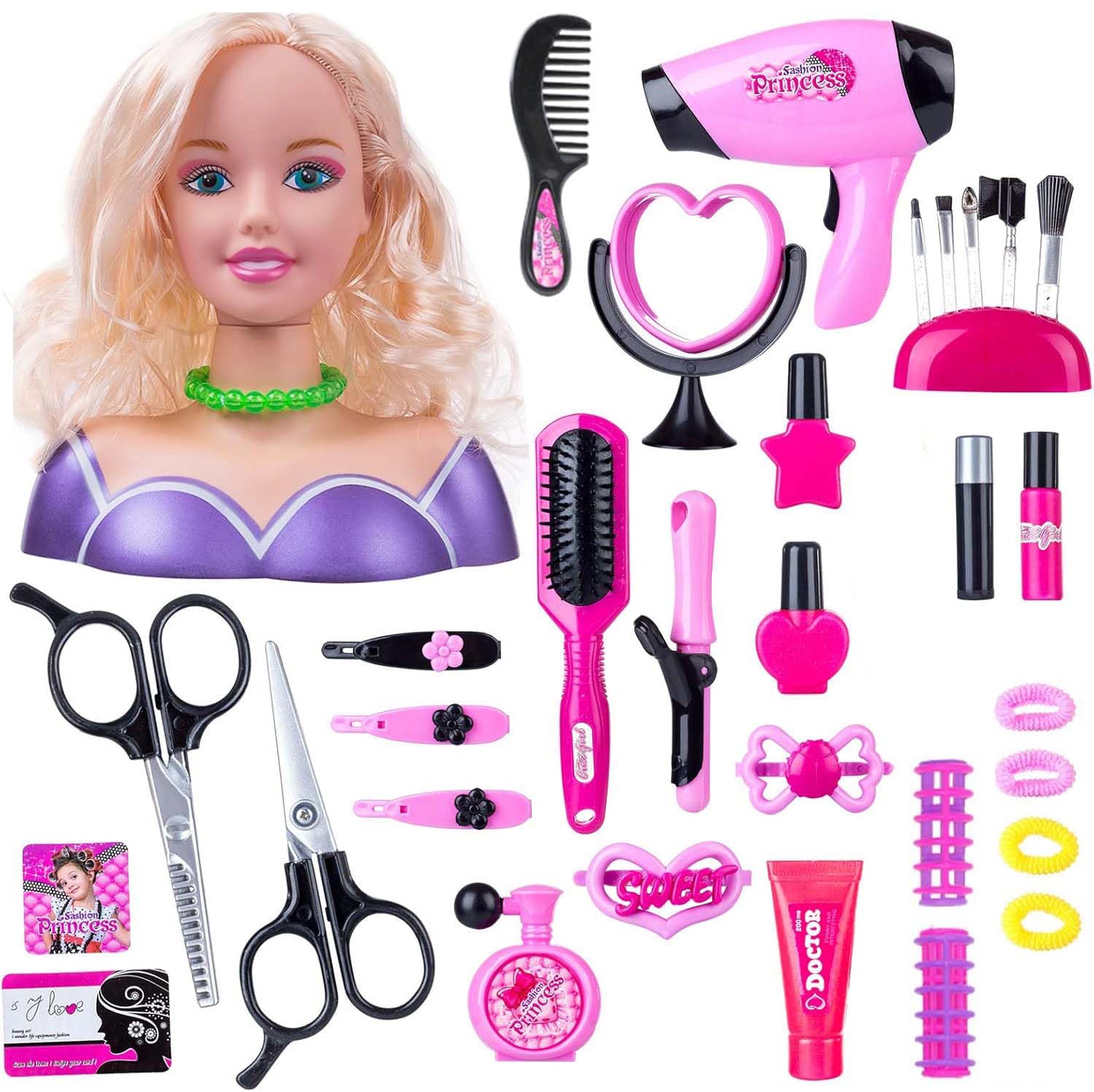 "Makeup Toys for Girls: Cute dolls with soft hairs and make up accessories, the hair is easy to comb for kids to make the hair style according to their design, and the hair dryers." "Educational Toys:Doll head toys set with colorful accessories as the product image displayed, inspiring kids' imagina