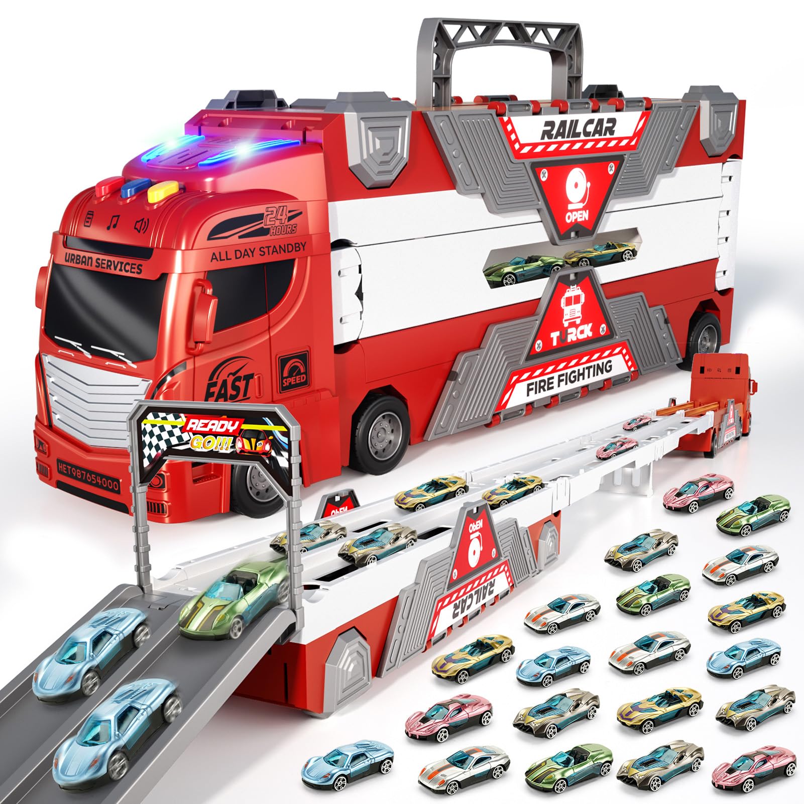 【21-in-1 Transport Fire Truck Toys for Toddlers Kids 2 3 4 5 6 7 8 Years Old】This fire trucks toy set for toddlers is a blast! It comes with 20 mini cars. You can just push them around for fun, or use the truck as a cool storage spot for the cars. And here's the best part: it transforms into a 6