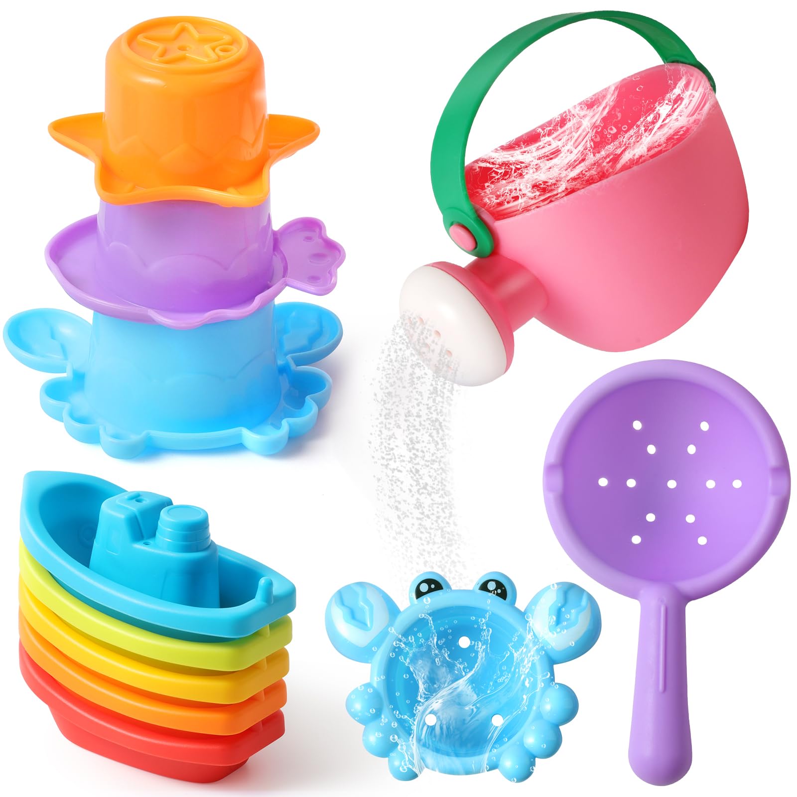 【BABY BATH TOY SET】This cute set includes 5 brightly colored floating boats, 1 soft plastic water bottle, 1 flexible rubber bath spoon and 3 plastic stacking cups (stacking cups color is random). Your baby will love taking a bath with them. 【DURABLE SAFE AND HIGH QUALITY】Made of safe materia