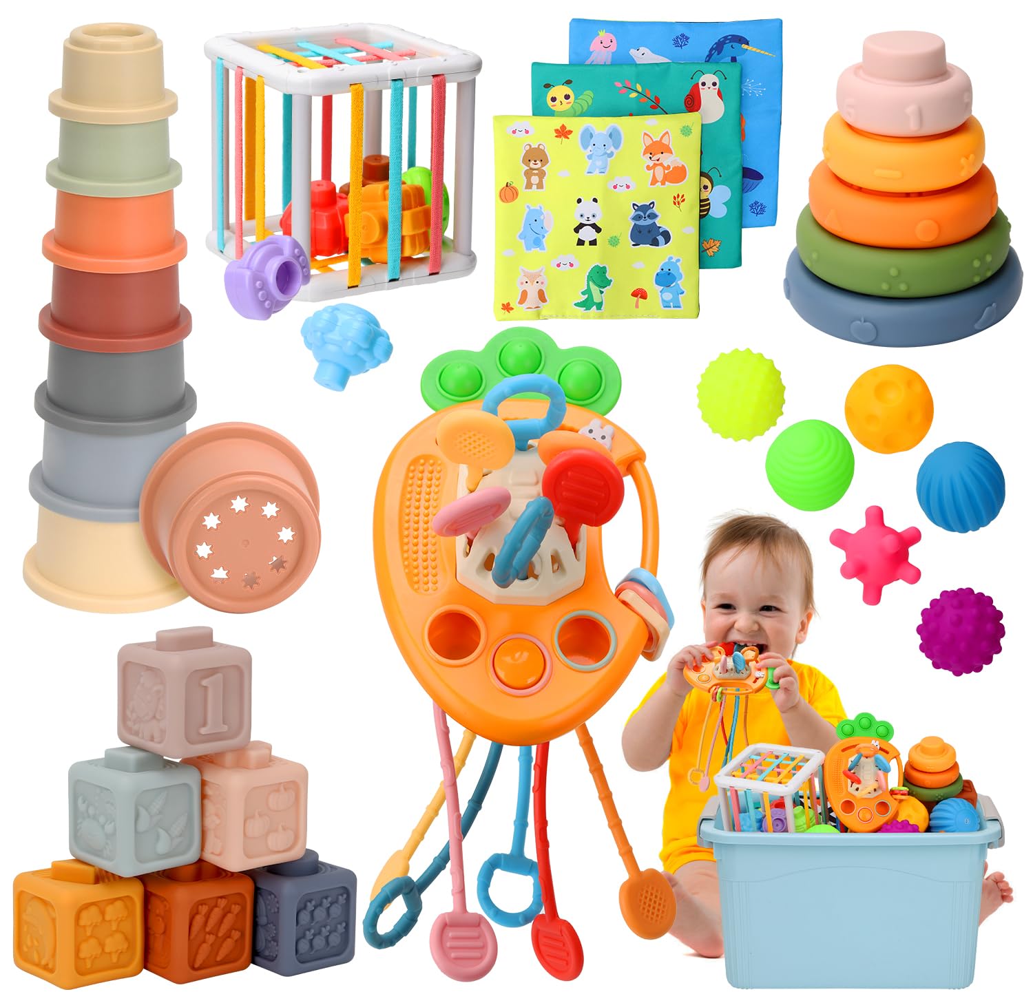 7 in 1 MONTESSORI BABY TOYS SET: Unleash the wonders of learning with our 7 in 1 Montessori Baby Toys Set! This set includes 3 infant crinkle papers,5 stacking rings,6 soft building blocks,6 tactile squishy balls,1 travel pull string toy,1 sensory explore bin with 6 sound blocks and 1 stacking cup s