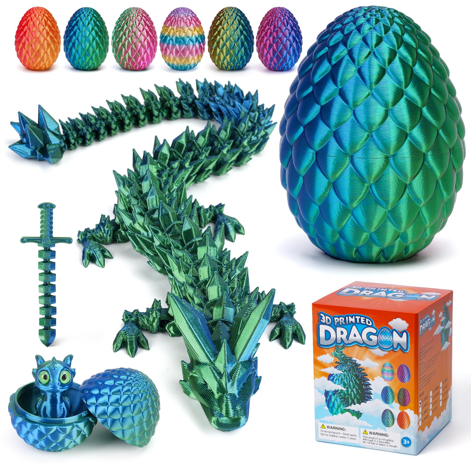 NIUCOO 12" 3D Printed Dragon Egg, Surprise Fidget Eggs with 12 inch Articulated Printer Crystal Dragon, Mystery Animals Dinosaur Kids Toy, Christmas