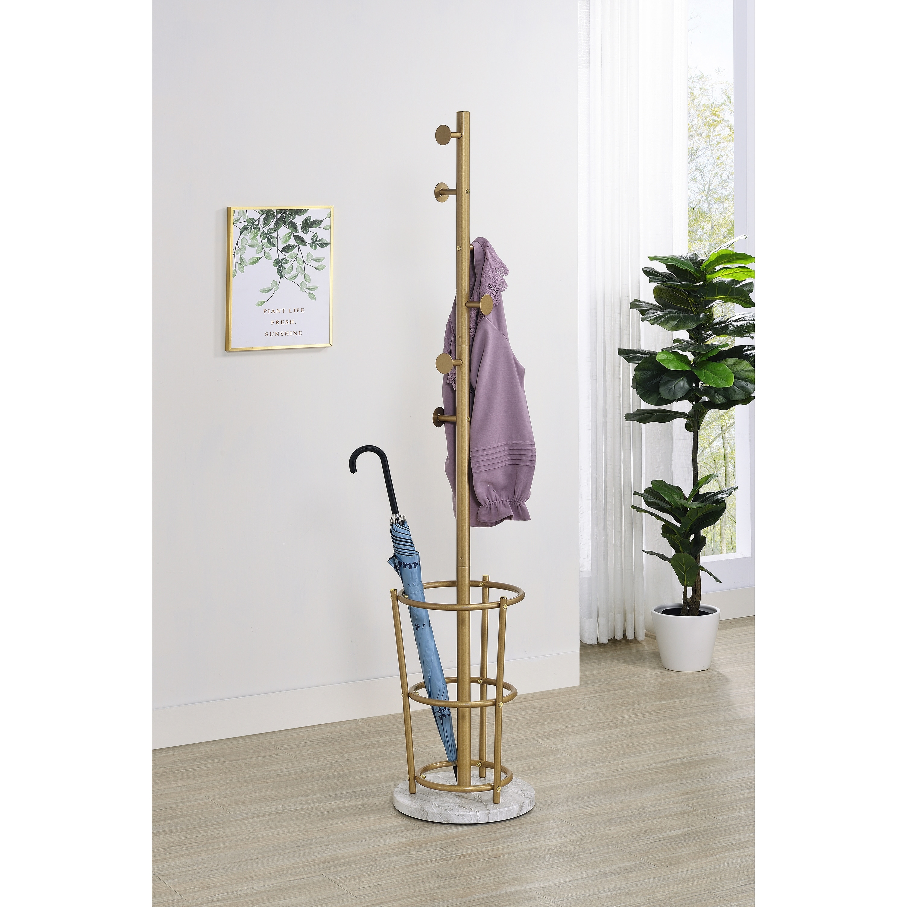 The Lodi Hat and Coat Stand combines modern elegance with everyday practicality. Built with a sturdy metal frame and a solid marble base, it keeps coats, hats, and umbrellas organized while adding a sophisticated accent to your entryway.