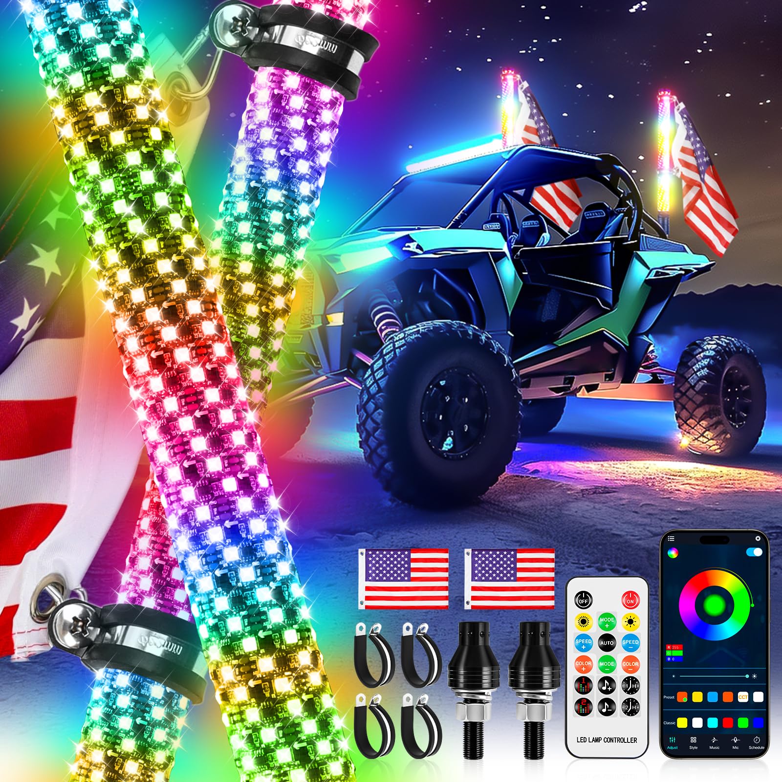DREAMOTOR Whip Lights, 2Pcs 2FT Fat Whip Lights for Side by Side with Wireless Remote and APP Control, LED Spiral RGB Chasing Lighted Antenna Whips