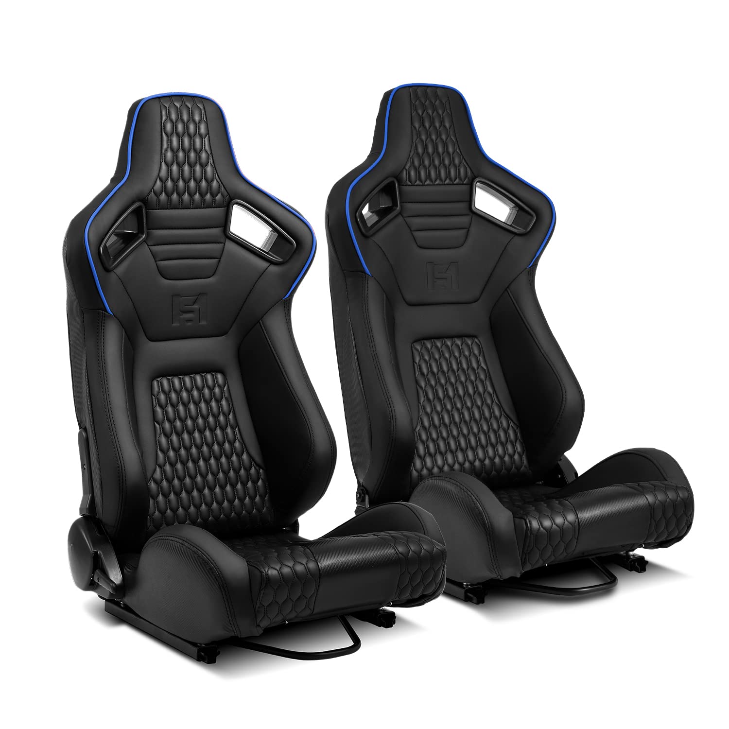 ModifyStreet Pair of All Black PVC Snake Pattern+Blue Stitching & Rear Carbon Fiber Style leather Reclinable Racing Seats W/Silders