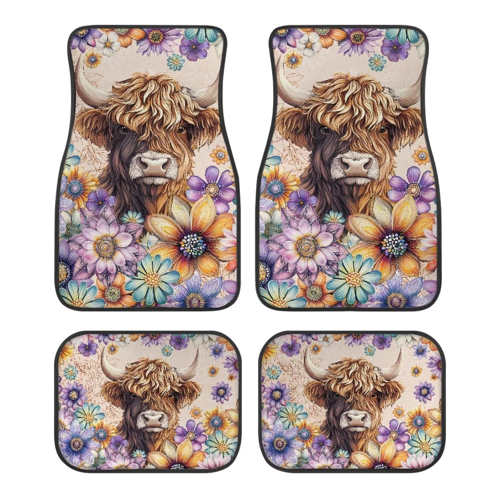 Oramclsy Bohu Flower Automotive Floor Mats Set of 4 Universal Fit Heavy Duty Rubber for All Weather Protection,Highland Cow Car Floor Mat Fit Most