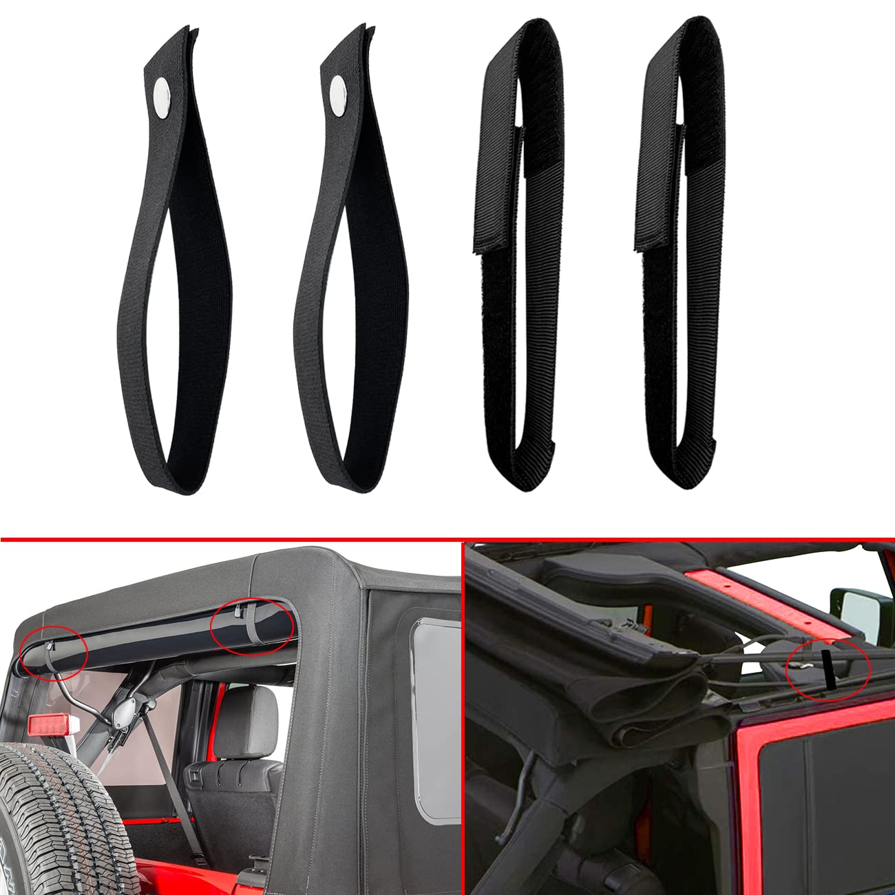 Fitment: These soft top and rear window straps is compatible withJeep Wrangler JK JKU 2007-2018,can also be applied to various scenarios in other vehicles, homes, and outdoors Function: The rear window straps for the Jeep Wrangler can roll up and securely fix the rear window. The tie-down strap for