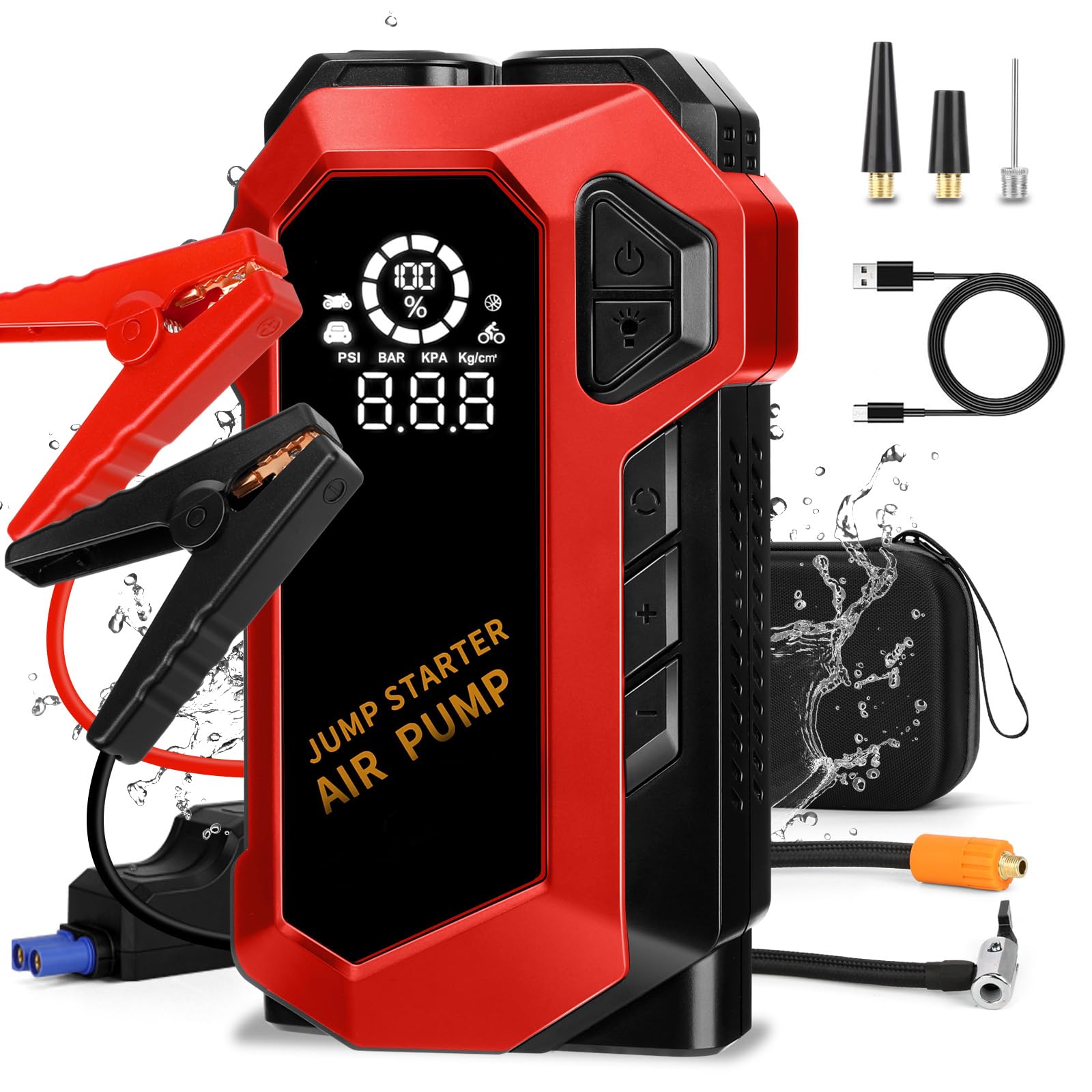 4 IN 1 CAR JUMPER BATTERY PACK: Looking for a reliable and compact vehicle tool for your vehicle? The E-ANT battery charger is just what you need! With its Jump Box, Tire Inflator, Power Bank, and LED Light, it's an essential tool to have on hand for any emergency. Car emergency kit includes: Jumper