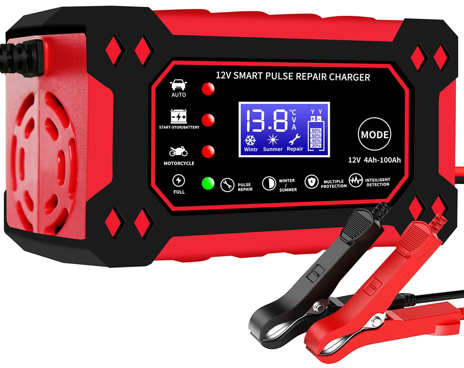 【Upgraded Smart Battery Charger】- This compact battery charger is suitable for 12V cars, motorbikes, pickup trucks, motorboats, ATVs, construction vehicles,SUV, RV, snowmobiles, lawnmowers, golf cart,etc. Suitable for most types of 12volt lead-acid batteries, including calcium batteries, gel, AG