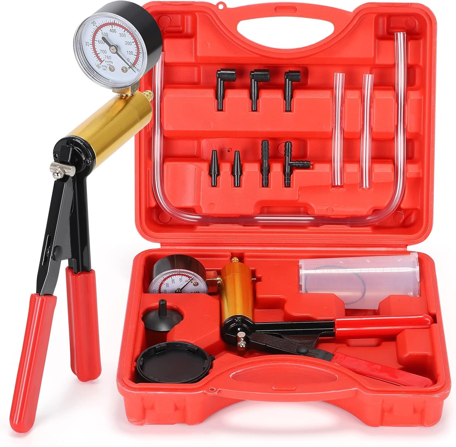 ACCESSORIES - The brake bleed kit is equipped with a vacuum gauge to facilitate reading the pressure. The pressure range is 0-30 Inch of mercury, 0-760mm of mercury. 4 pipes of different lengths to meet different needs. We add a spare O-ring for each product. VACUUM PUMP TEST SET - It includes diffe