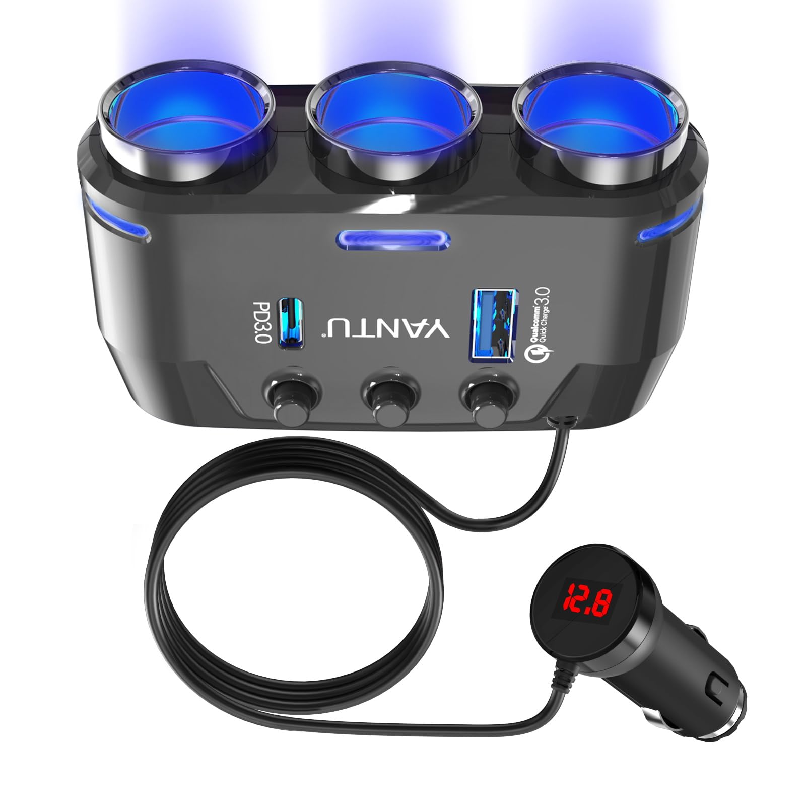 YANTU QC3.0&PD Cigarette Lighter Adapter, 3-Socket 140W Car Cigarette Lighter Splitter with 12v USB Outlet,Car Charger Adapter with Double/Dual/USB C
