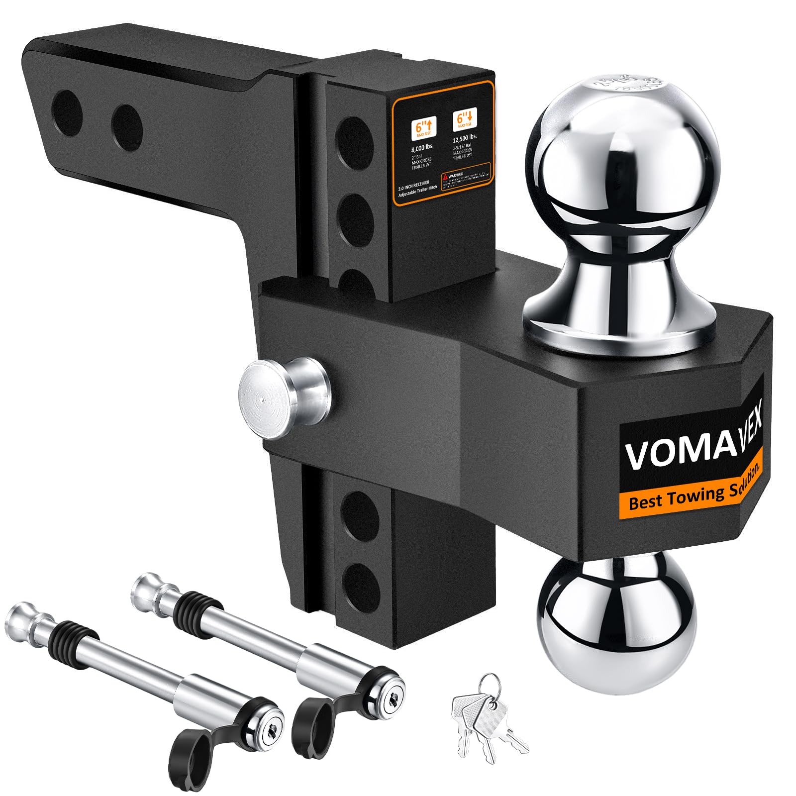 Adjustable Trailer Hitch-Drop Hitch Fits 2-Inch Receiver -6" Drop/Rise Tow Hitch with 2" and 2-5/16" Tow Balls-12,500GTW with Double Anti-Theft Pins