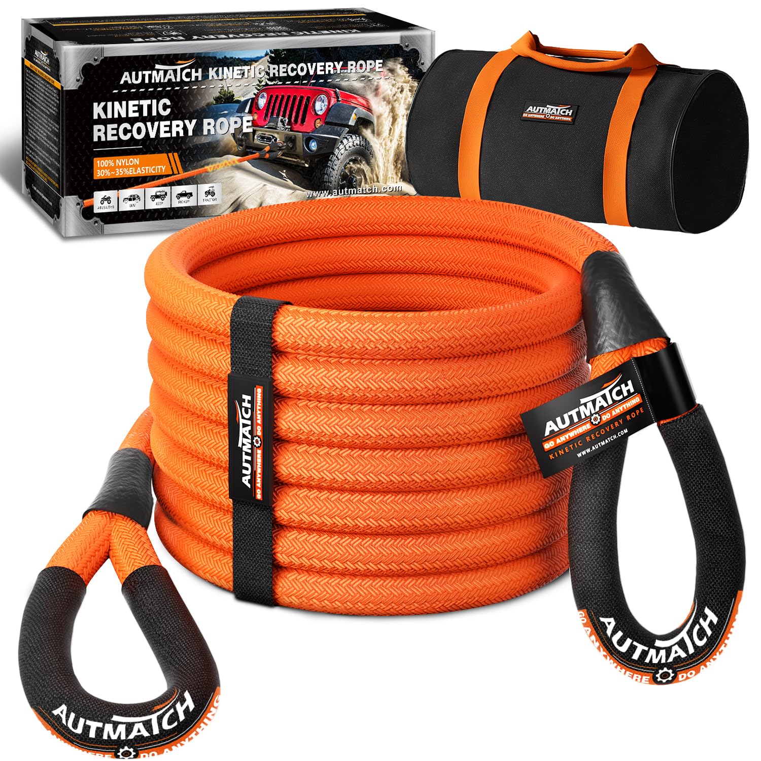 AUTMATCH Kinetic Recovery Tow Rope 1" x 20FT - Heavy Duty Offroad Snatch Strap 48000Lbs, 35% Elasticity Energy Recovery Tow Rope for 4x4 Off-Road