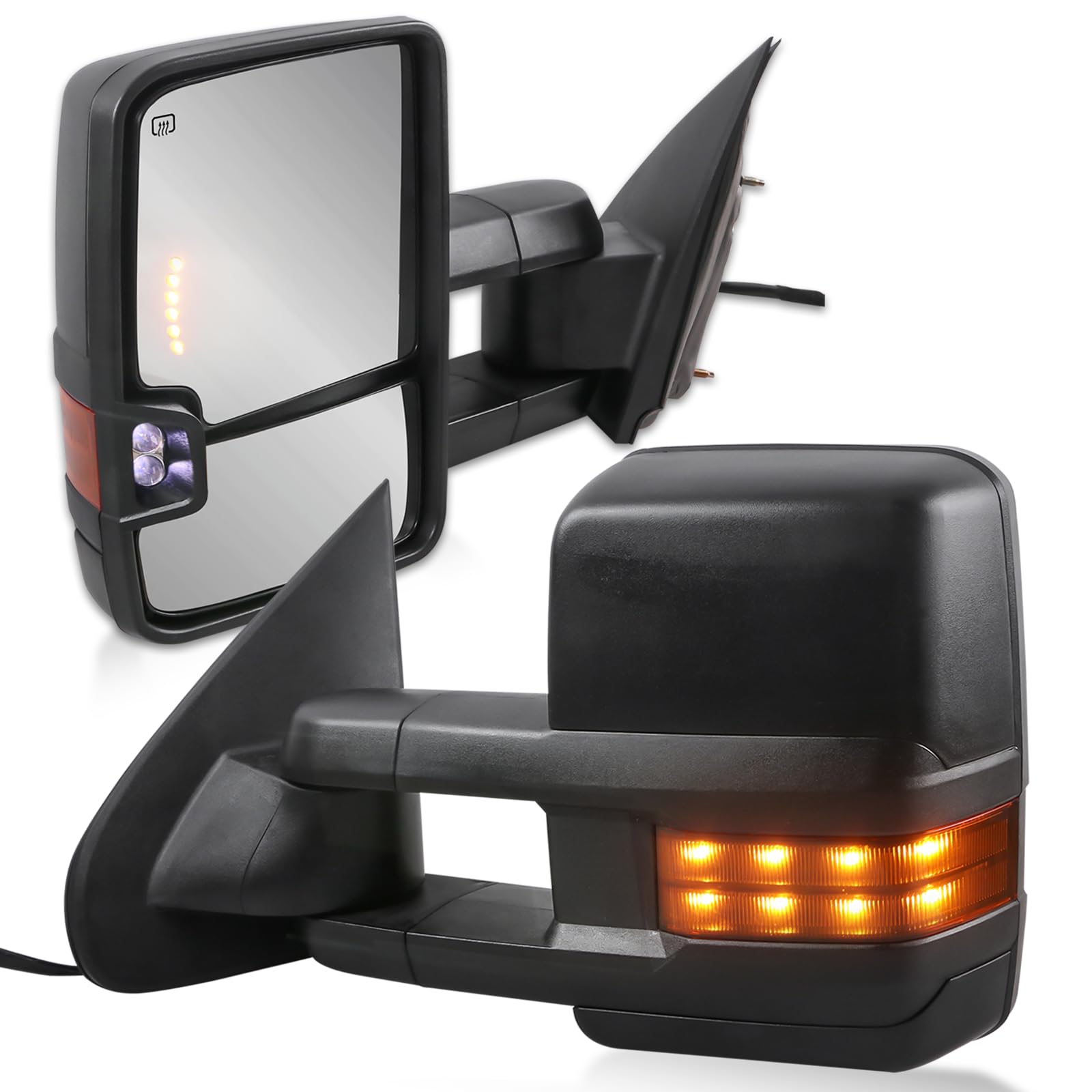 FITMENT Compatible with :2014-2018 Chevy Silverado 1500; 2015-2018 Chevy 2500HD/3500HD; 2014-2018 GMC Sierra 1500; 2015-2018 2500HD/3500HD Feature: MOSTPLUS Black Housing Towing Mirror is Power Heated with Flashing Turn Signal Lights, Built-in Red Turn light, and Clearance Light, Manual Telescoping