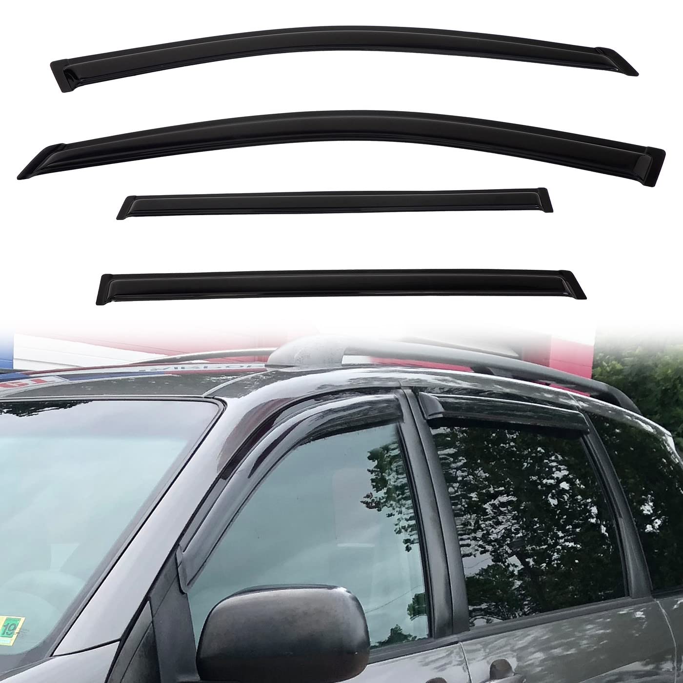 Compatible with 2004-2010 Toyota Sienna Item-offered:4pcs front + rear vent window visors (3M Tape Included) Color: Dark Smoke Tint ; Material: Reinforced Acrylic Style:Outside Mount Style (Stick on to the door & above the windows.Not In-Channel Style) Installation Type: Direct Tape-On Design. No Cu