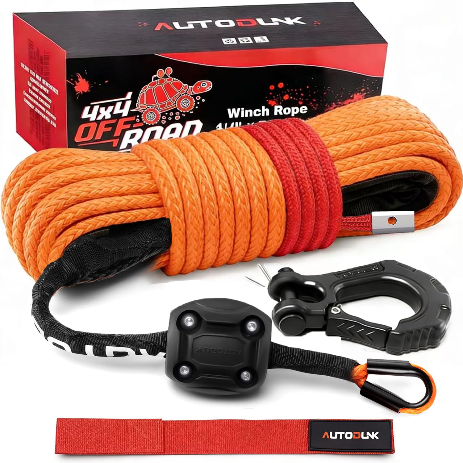 Autodunk Synthetic Winch Rope - 1/4" x 50ft 10,000LBS Winch Line with Protective Sleeve, Forged Winch Hook and Rubber Stopper, Synthetic Winch Cable