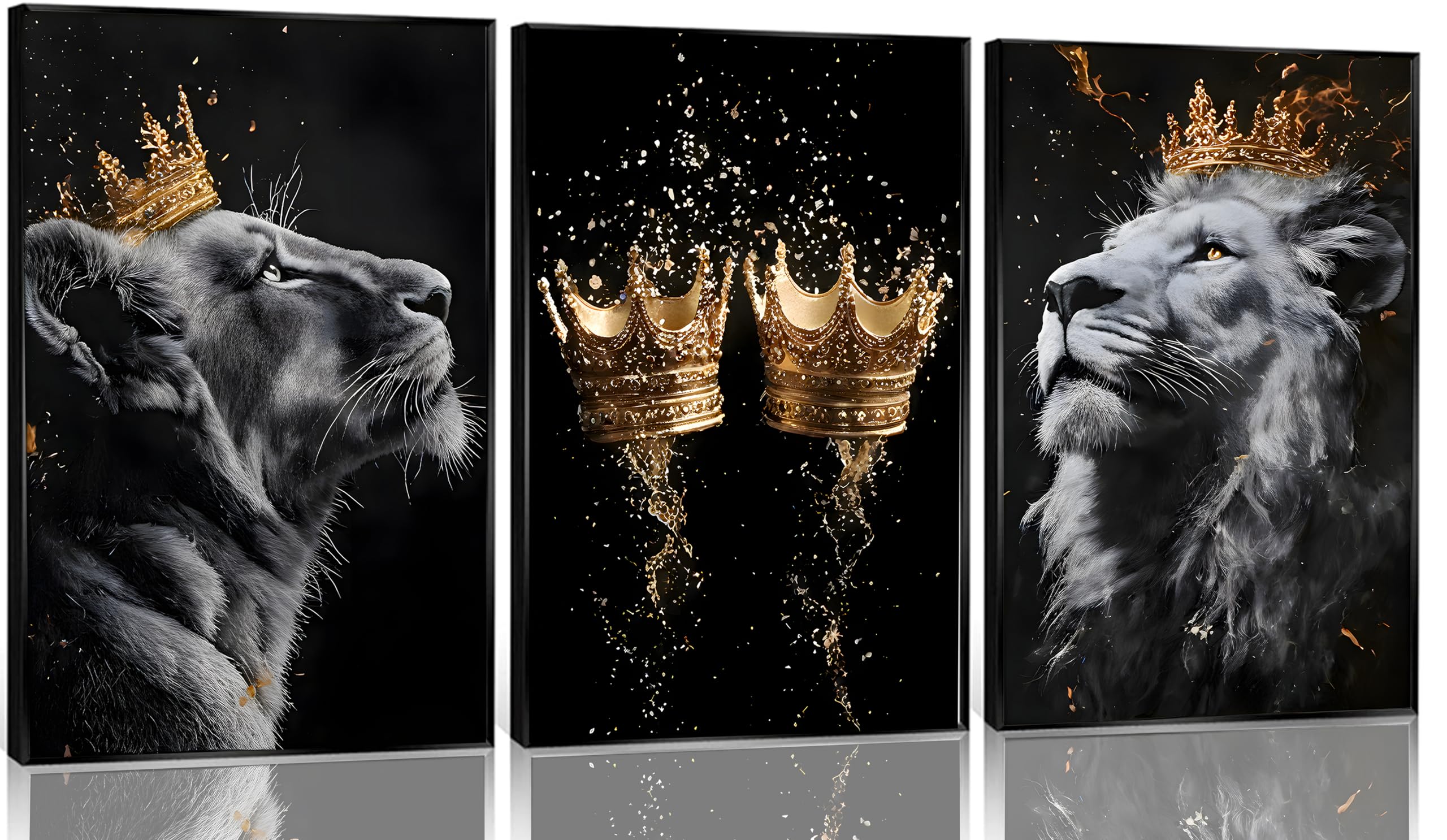 3 Pieces Lion Canvas Wall Art Golden crown with lion Poster print Modern Motivational Black And White Lion Pictures Wall Decor for Living room Office