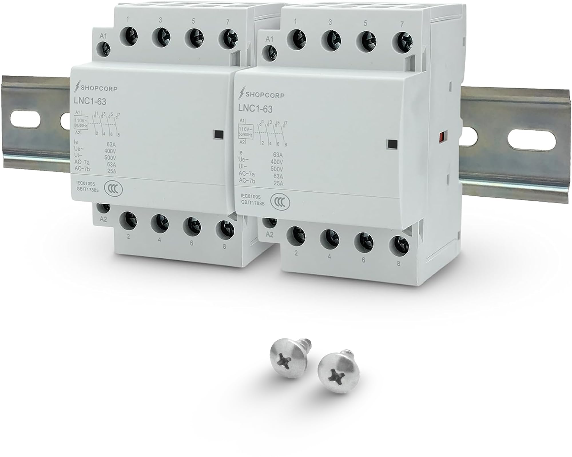 8 Pole Contactor (4 pole x 2) – Bundle content 5 items: two (2) 40 Amp 4 Pole Normally Open (NO) AC contactors with power status indicator, one compatible slotted steel zinc plated DIN rail (35mm x 150mm), and two stainless steel truss head screws (#10, 1/2") for immediate home or industrial insta