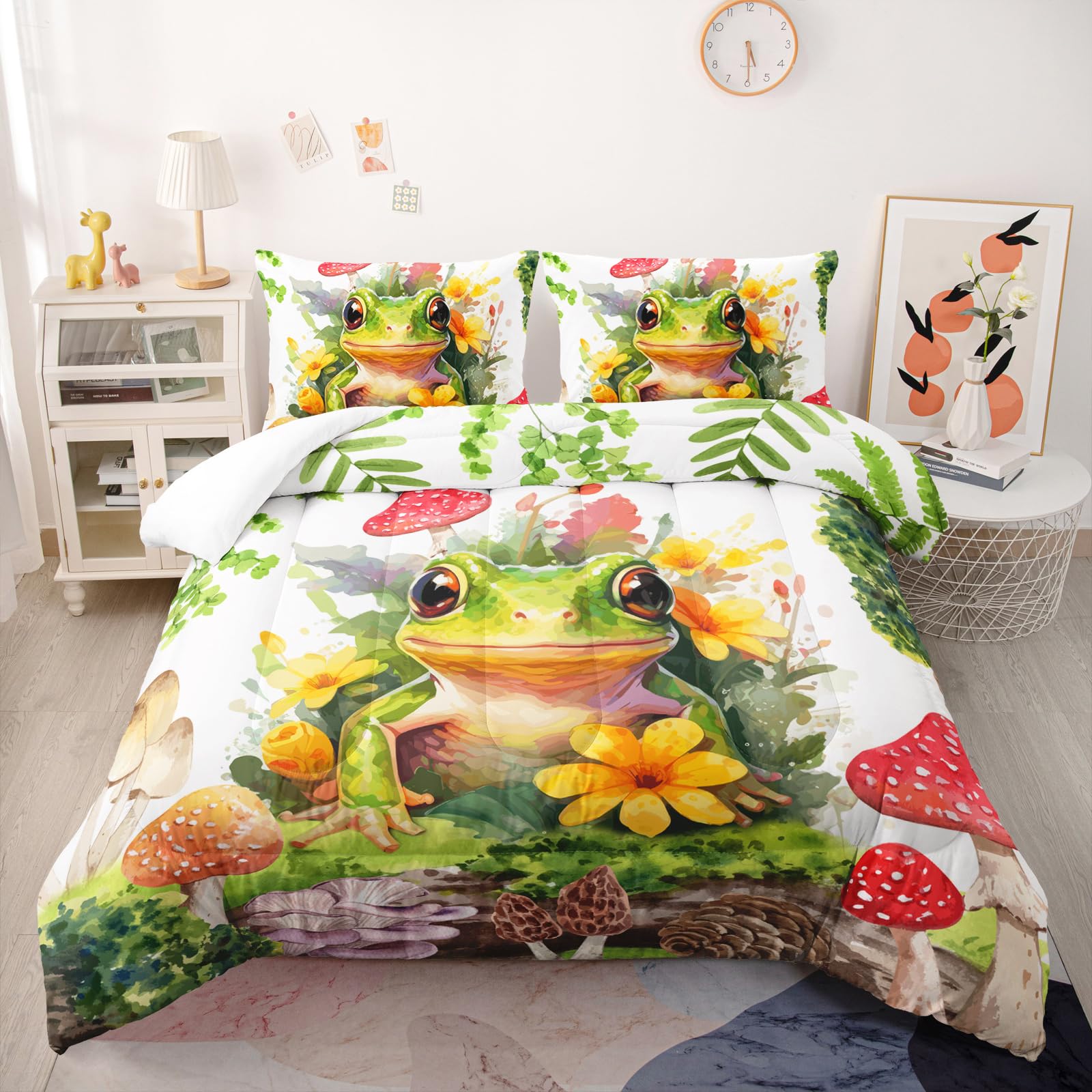 Nttopship Frog Mushroom Print Comforter Set Full Size,Cartoon Rainforest Tree Frog Bedding Set,Jungle Animals Plant Printed Quilted Set for Girls Boys