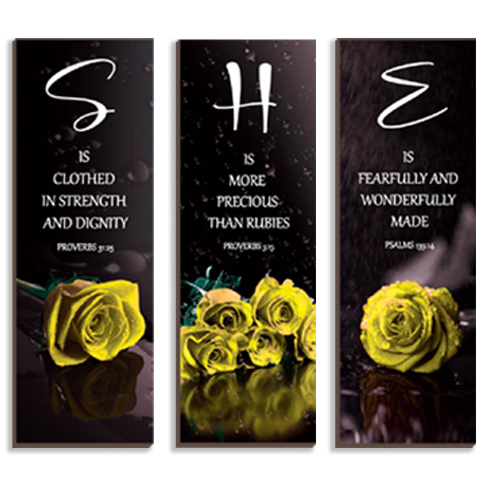 DONFENTHY 3 Pcs Yellow Bedroom Decor Yellow Rose Wooden Wall Decor Yellow Bathroom Decor Inspirational Farmhouse Office Signs With SHE Bible Words For