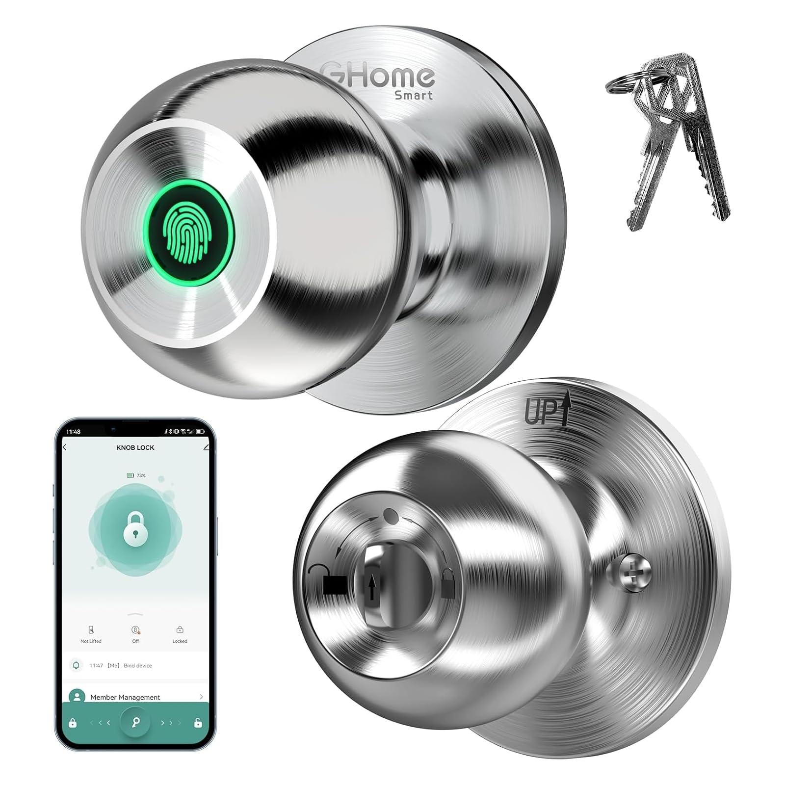 GHome Smart Fingerprint Door Lock, 3 in 1 Smart Fingerprint Door Knob with App Control & Key, Auto Lock, Biometric Door Knobs with Lock for Bedroom,