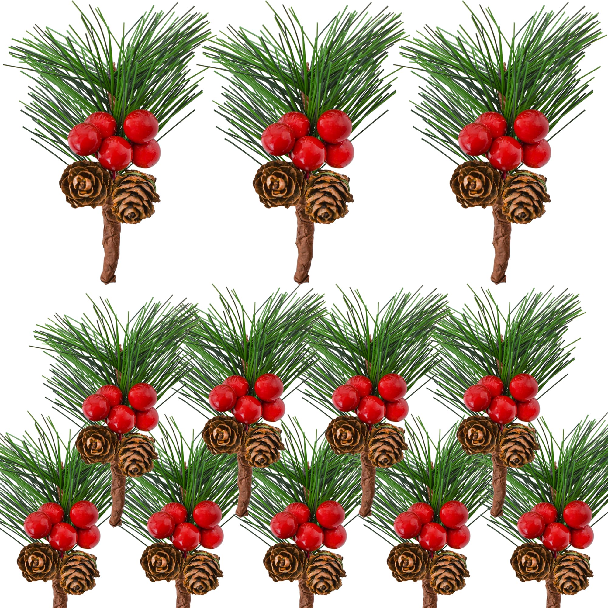 Bacucine 12PCS Christmas Berries Pine Cones Artificial Floral Picks Winter Garland Christmas Decorations with Red Berries Pine Needle for Craft Table