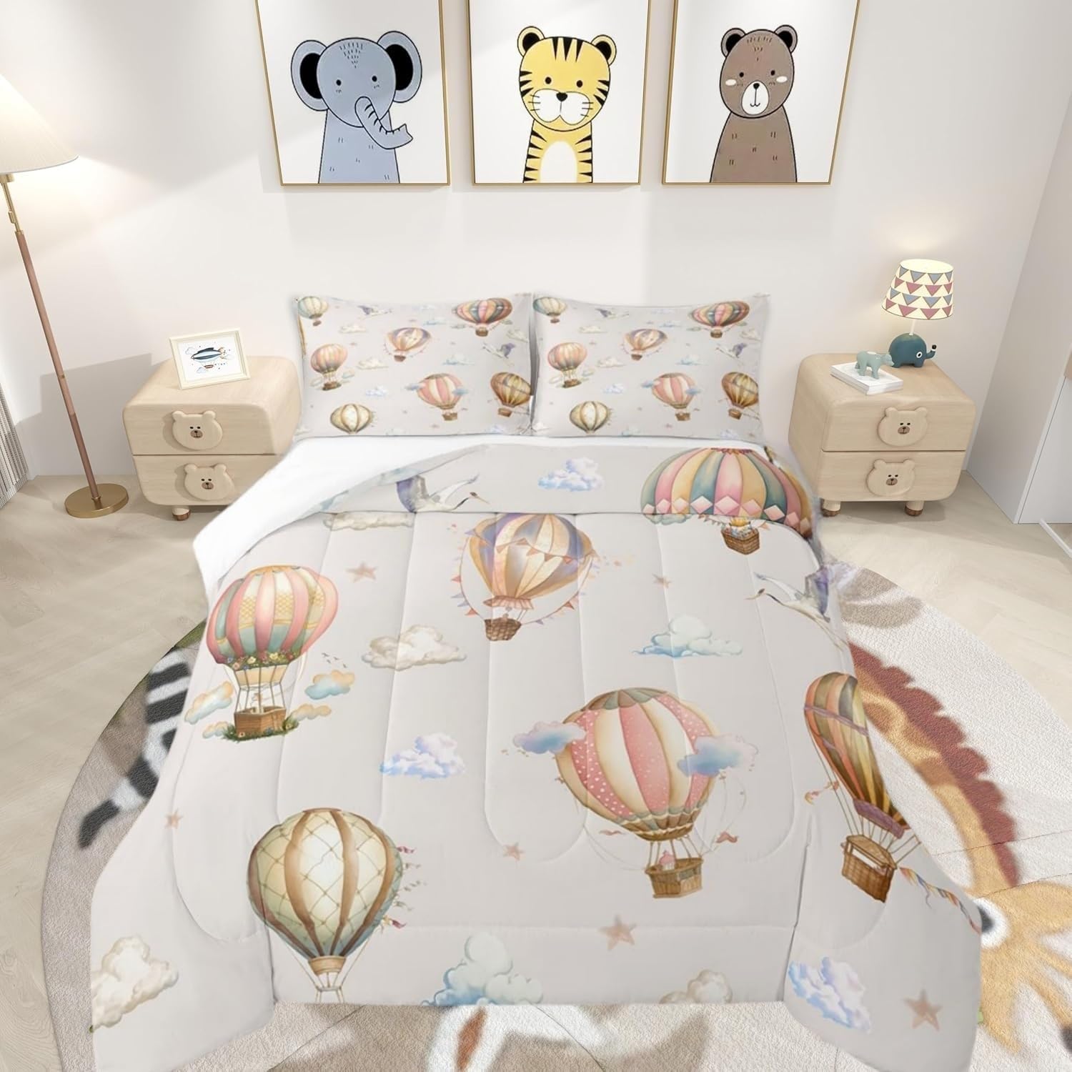 Manfei Hot Air Balloon Kids Comforter Set Twin Size,Cloud Starry Sky Cartoon Balloons Bedding Set,Boys Girls Room Decor,White Crane Bird Animal Down