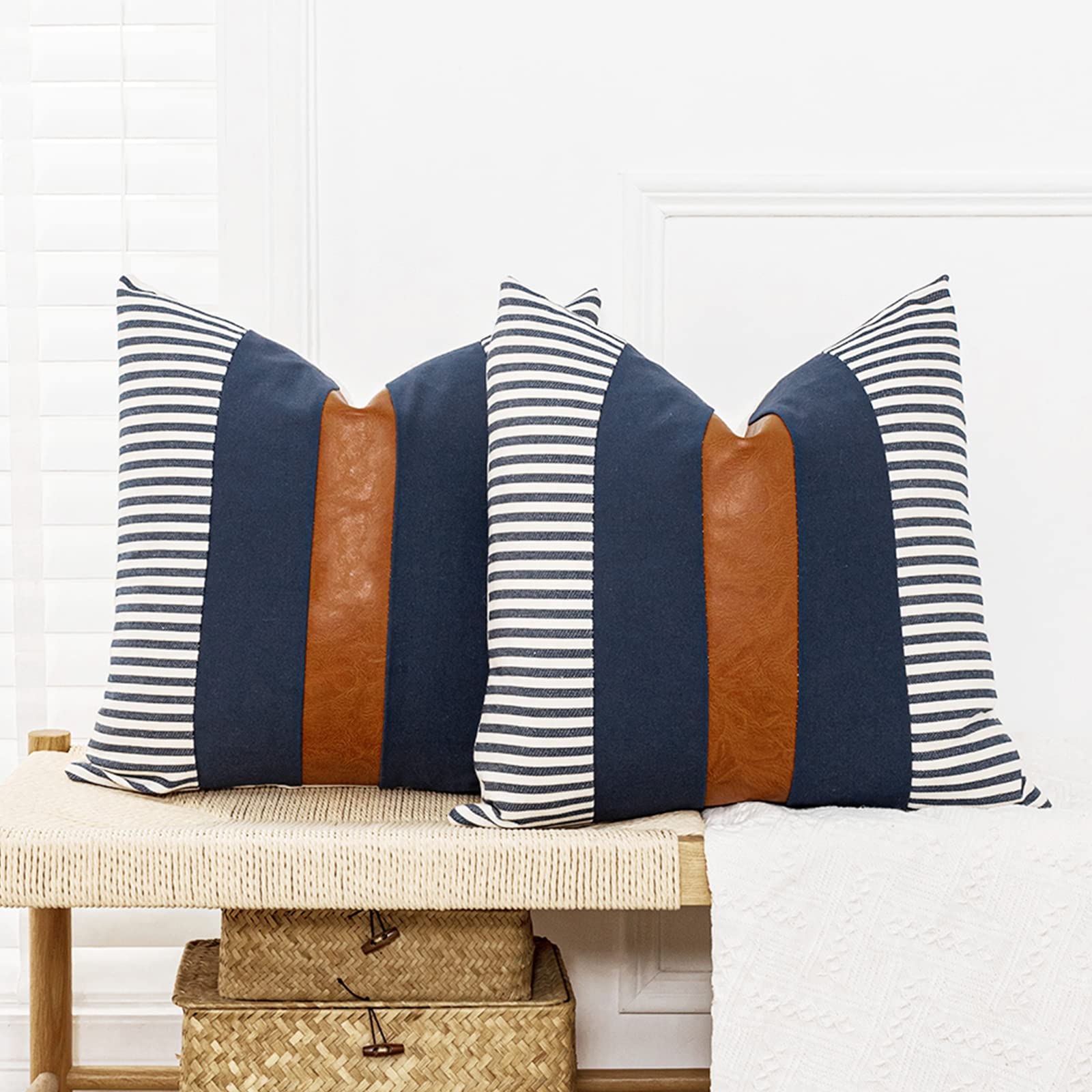 Material & Size- Front side of these farmhouse stripe pillow covers are made of high quality cotton fabric patchwork with faux leather accent decor. Backing is natural cotton fabric. Packaged included pack of 2 modern accent pillow covers 20 x 20 Inch / 50 x 50 cm. Covers ONLY , NOT include insert.