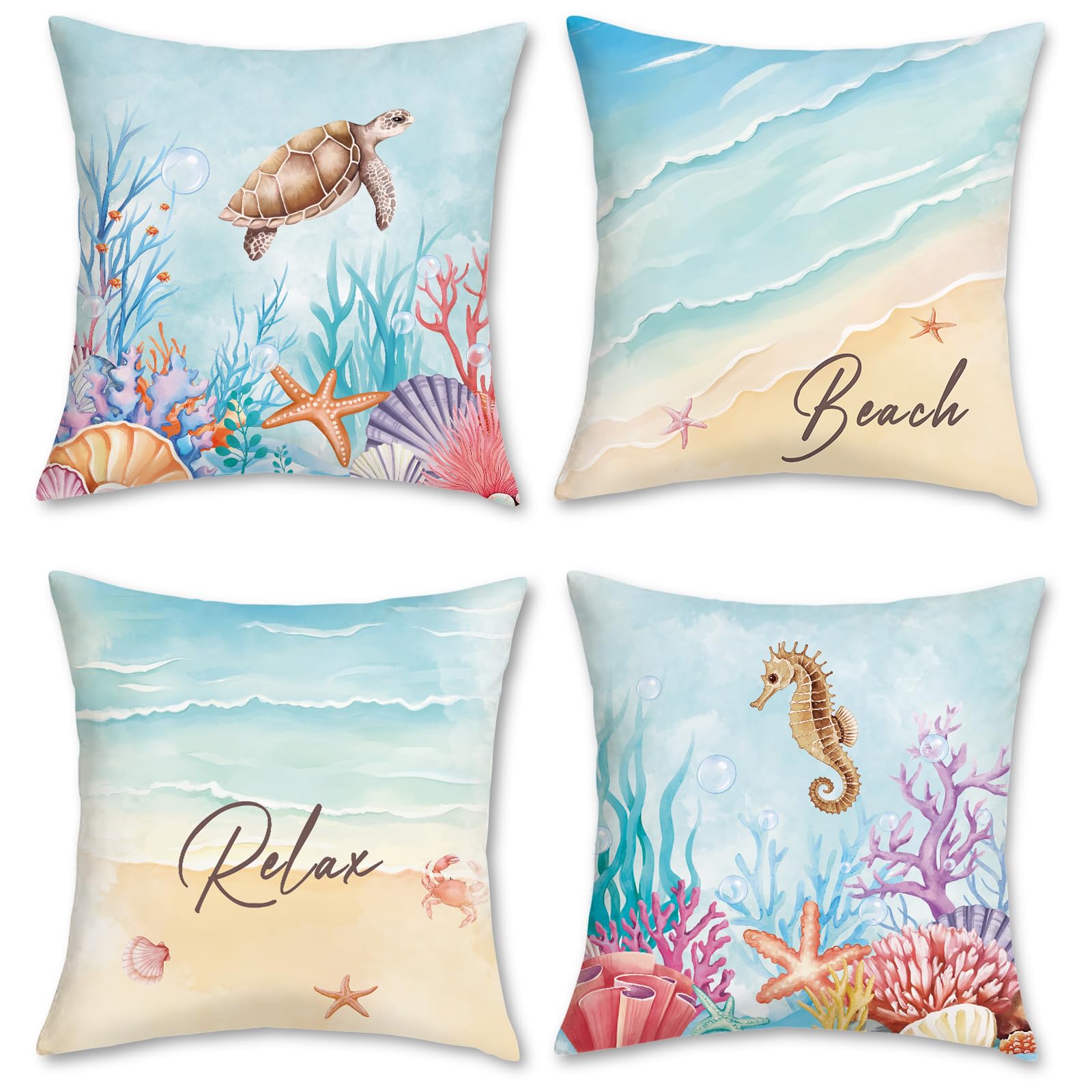 COZZSNUGE Coastal Beach Throw Pillow Covers, Ocean Sea Turtle Seahorse Coral Summer Velvety Decorative Pillowcases for Sofa Bed Home Patio Set of 4,