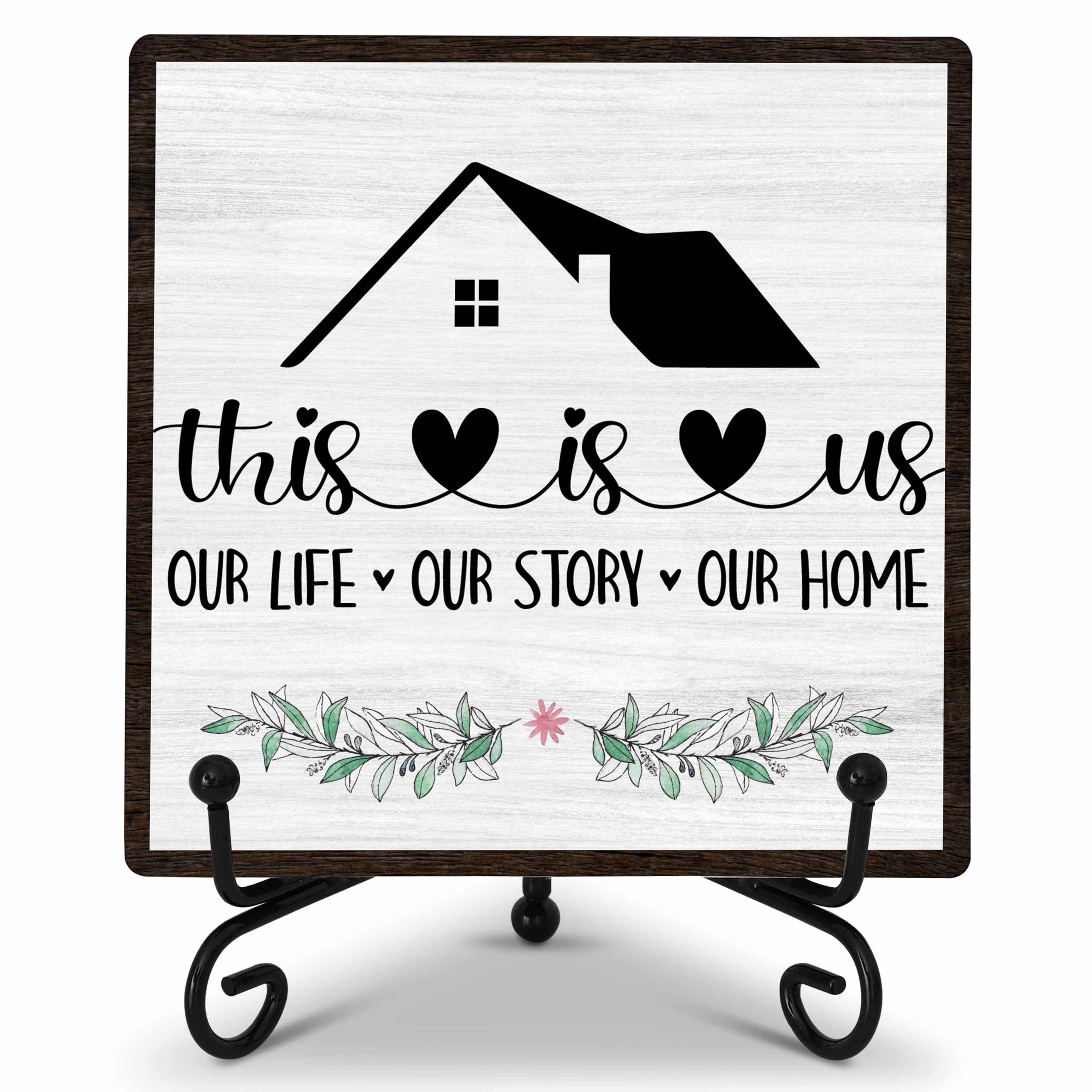 GOLRMC Welcome Home Sign, Home Kitchen Decor and Accessories, This Is Us Sign, Farmhouse Wooden Plaque with Iron Stand for Living Room Bedroom Table
