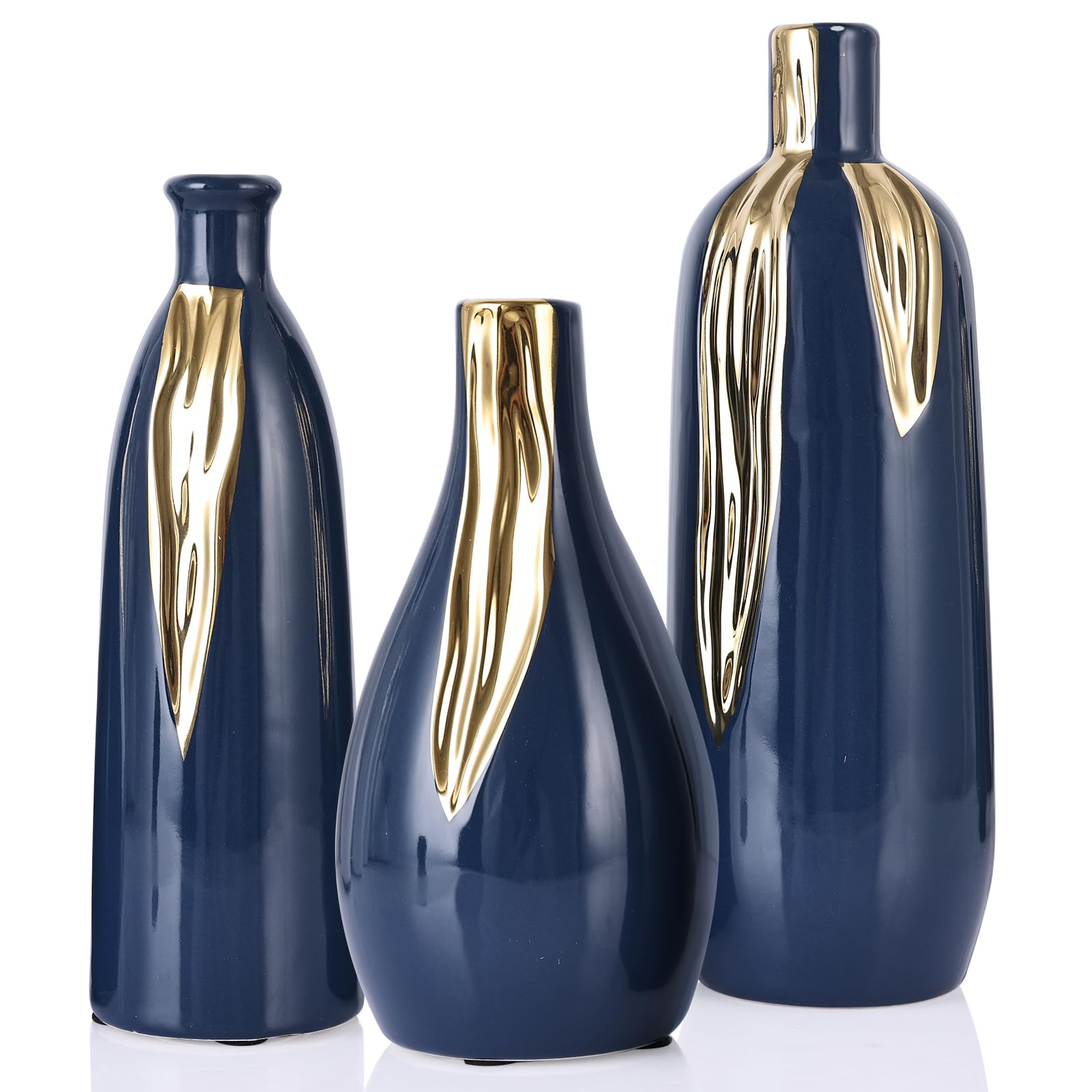 Ceramic Vase Set of 3, Blue and Gold Vases for Home Decor Farmhouse Vases, Mantels, Shelves and Entryways, Table Centerpieces, Living Rooms,