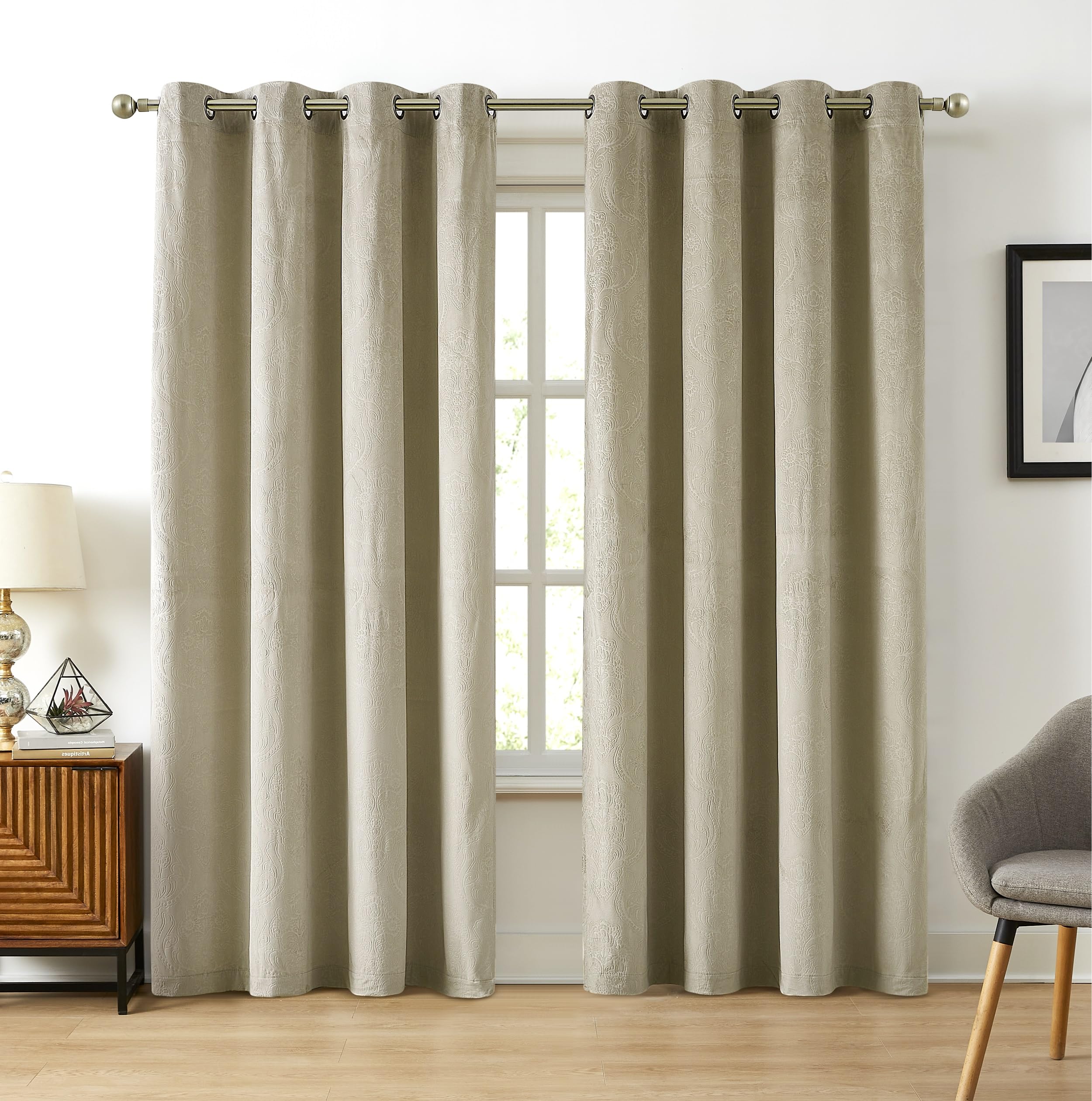 LinenZone Velvet Curtains with Elegant Embossed Design. 84 Inch Velvet Beige Curtains are Perfect as Bedroom Curtains, Room Darkening Curtains or