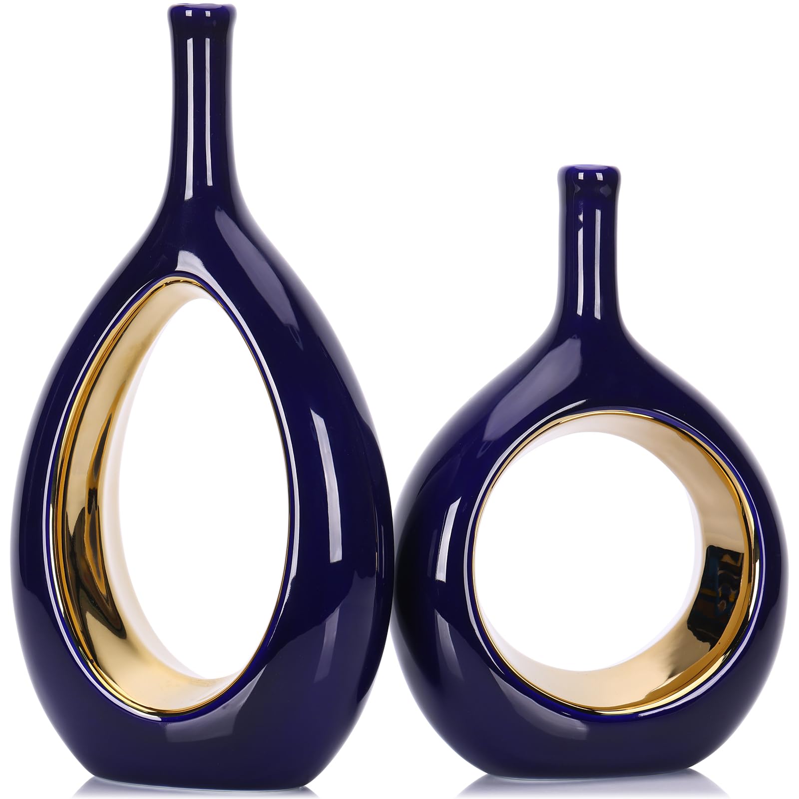 Blue and Gold Vase Ceramic Blue Vases Home Decor,Modern Minimalist Circle with Hole Decorative Vase, Hollow Ellipse Flower vases for Bookshelf,