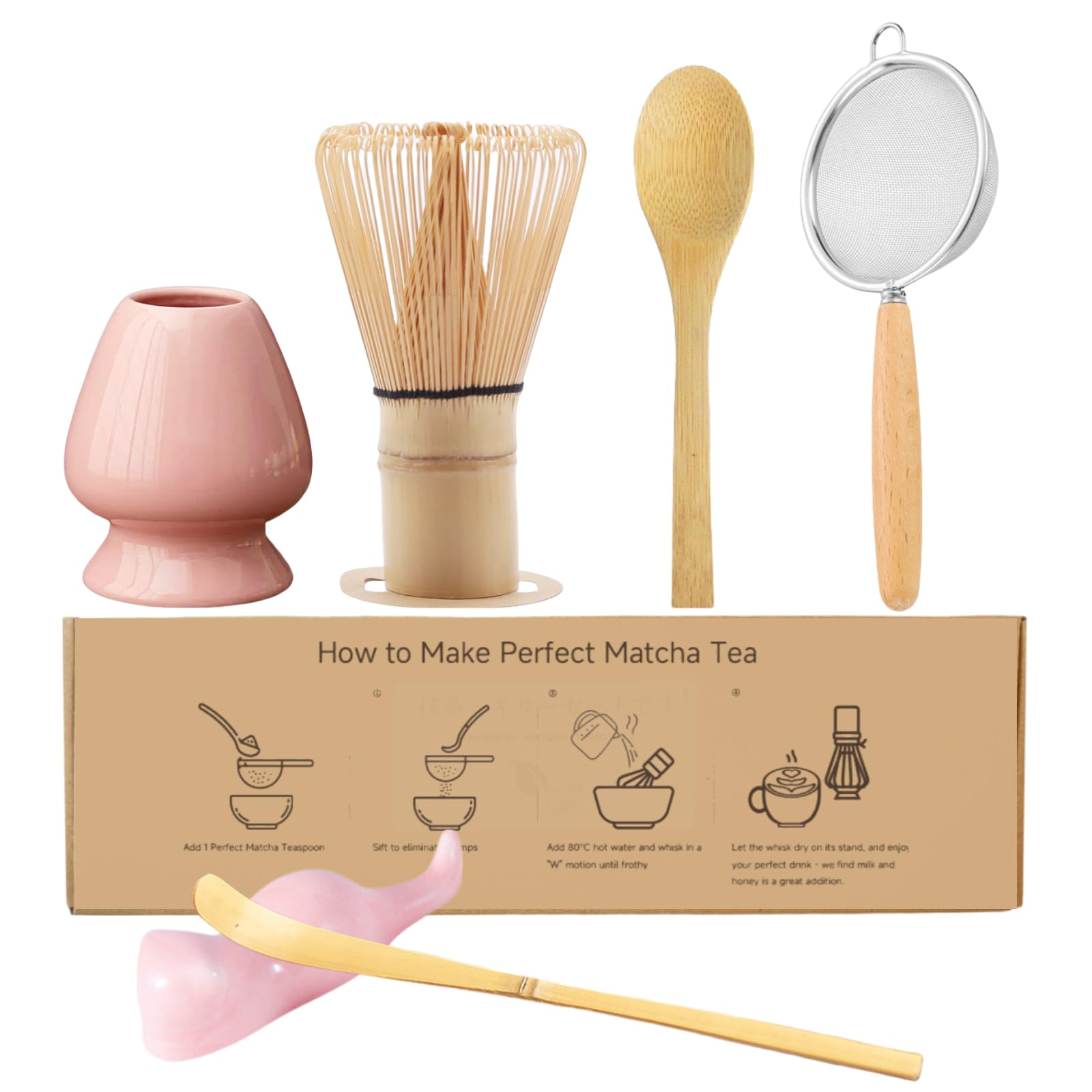 【Complete Matcha Whisk Set for Beginners】 This 6-piece matcha tea set includes everything you need to make authentic Japanese matcha at home — a 100-prong bamboo whisk (chasen), ceramic whisk holder, stainless steel sifter, bamboo scoop, wooden spoon, and a cute cat-shaped holder. Perfect for